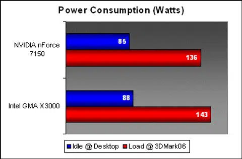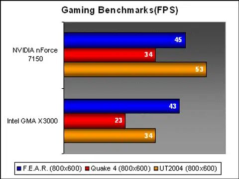 F.E.A.R. turned out to be a pretty well matched benchmark for both GPUs as the Intel GMA X3000 actually managed to keep up with the GeForce 7150. In F.E.A.R., we ran the benchmarks at 'Low' graphics setting at 800x600. Both boards generated playable frame rates with half decent image quality. The GeForce 7150 won comfortably for the other two games. Most notably was the difference in rendering quality (not speed) in Quake 4. Being an OpenGL game, the Intel GMA X3000 was unable to render scenes properly and even colors were off. This is perhaps one of the strongest arguments for NVIDIA. Taking away the performance aspect, the GeForce 7-series mGPU share the same capabilities, features and driver support as its discreet counterparts, which means consistent image quality and application compatibility.