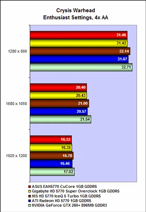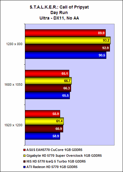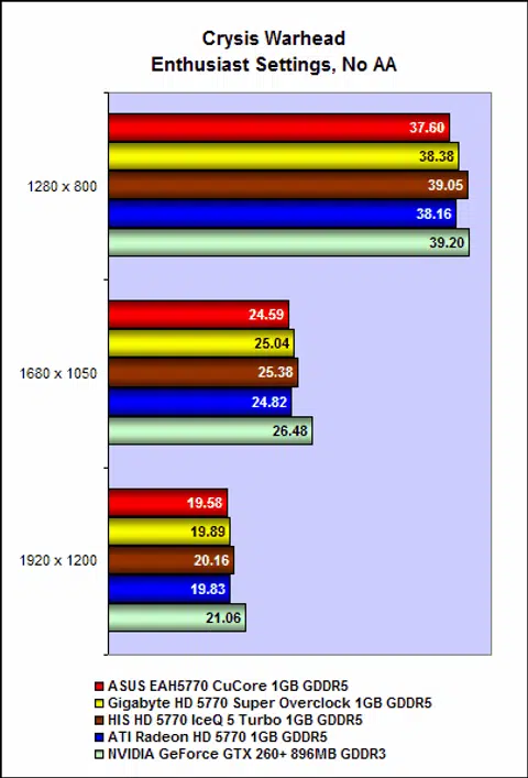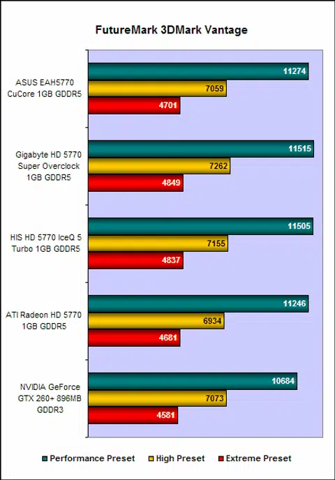 With the ASUS EAH5770 CuCore being the lone exception due to its reference clock speeds, both the HIS HD 5770 IceQ 5 Turbo and Gigabyte HD 5770 Super Overclock performed as they should, thanks to their higher clock speeds.