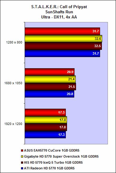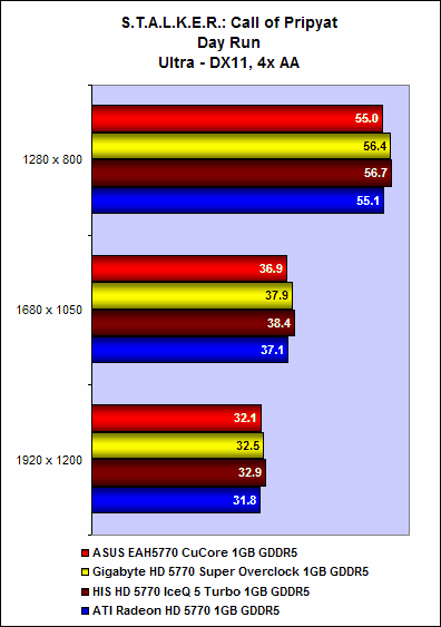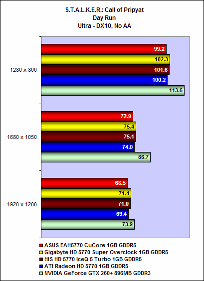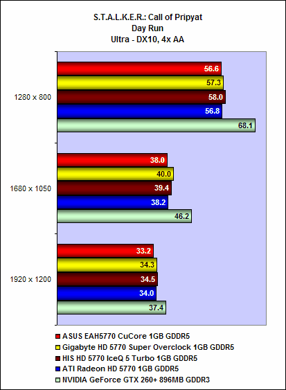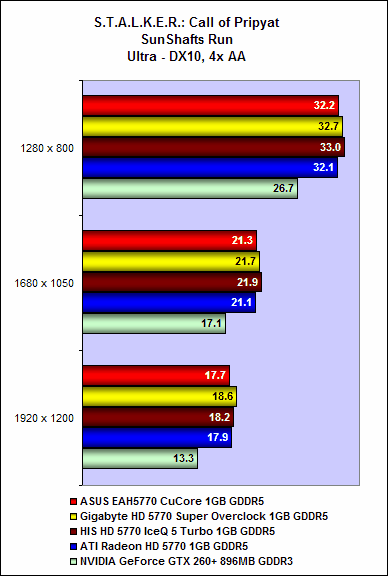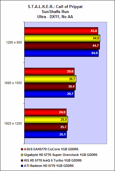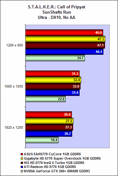 Results from S.T.A.L.K.E.R.: Call of Pripyat yielded the same findings as our previous two benchmarks. While the overclocked duo of Gigabyte and HIS were quicker, the difference was, once again, minimal – around 3%. On the DirectX 10 runs, we noticed also that the NVIDIA GeForce GTX 260 was still competitive against the newer Radeon HD 5770, easily outscoring them on the “Day” run. However, performance suffered greatly when it came to the more taxing “Sunshafts” run.