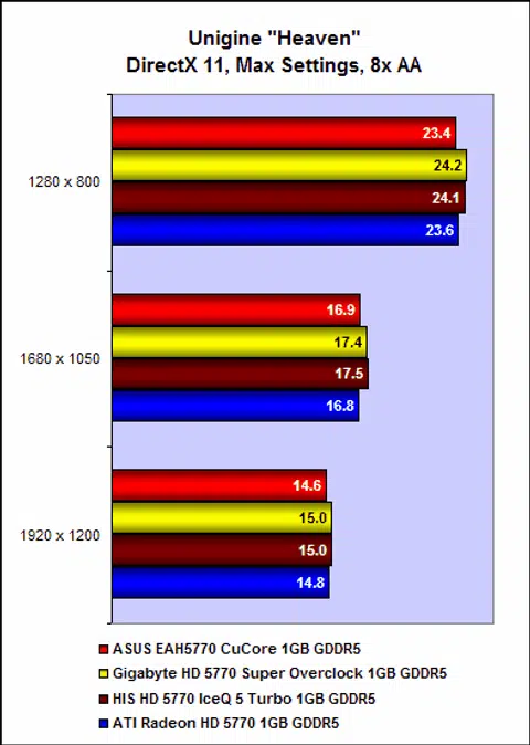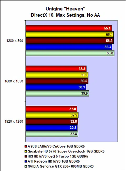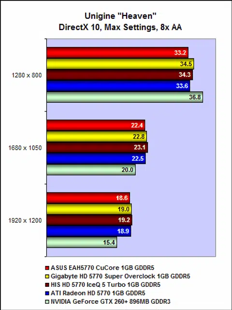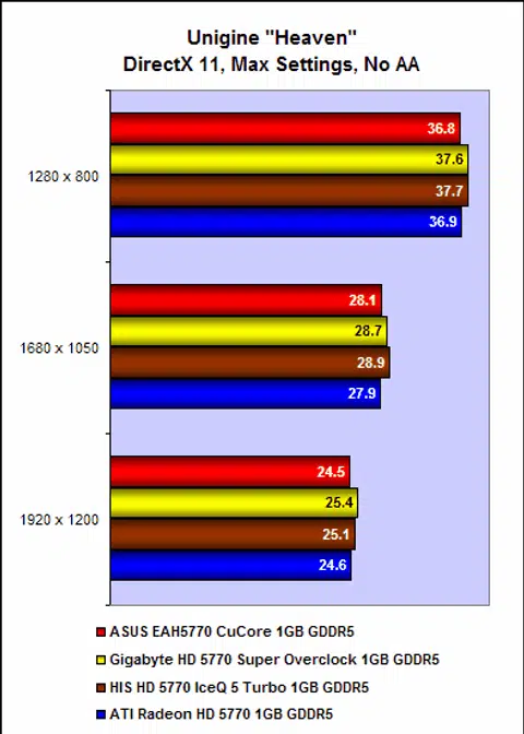 The results on Unigine's “Heaven” benchmark mirrors that of Bad Company 2, where there's two noticeable tiers of performance. Naturally, the ASUS EAH5770 CuCore and the reference Radeon HD 5770 was slower, but like in previous benchmarks, the difference wasn't much. And once more, the Gigabyte HD 5770 Super Overclock failed to garner any significant lead over the HIS HD 5770 IceQ 5 Turbo.