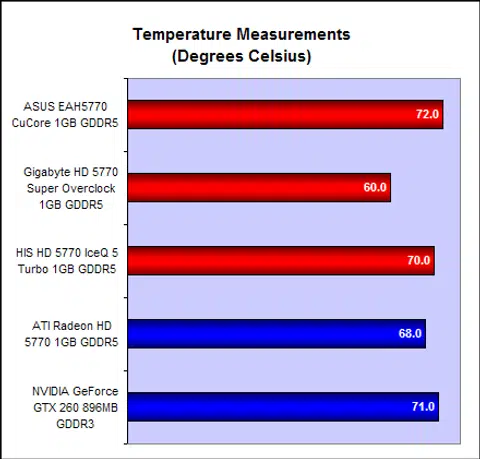 Where raw graphics performance was concerned, the cards were mostly evenly matched, but when it came to the effectiveness of their custom coolers, there was a clear winner. The Gigabyte HD 5770 Super Overclock recorded a maximum operating temperature of a cool 60 degrees Celsius, which represents a significant 8 degrees Celsius improvement over ATI's reference design.