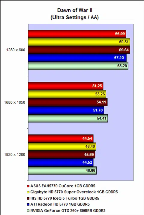 On Dawn of War 2, the two overclocked Radeon HD 5770 cards from Gigabyte and HIS managed noticeably higher frame rates, but it was still a tightly contested affair as the difference was about 4% at most. Also, the higher clocked Gigabyte HD 5770 Super Overclock was still unable to consistently outperform its HIS rival.