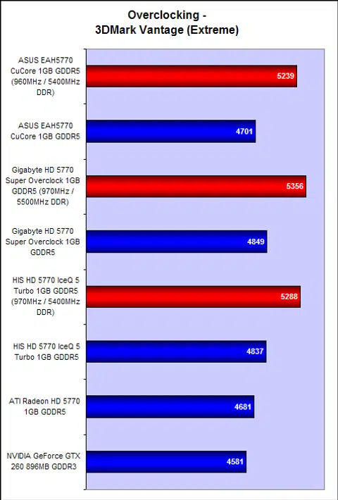 While the Gigabyte HD 5770 Super Overclock failed to convincingly outperform its lower clocked rival, the HIS HD 5770 IceQ 5 Turbo on stock performance, it did well on our overclocking tests, as we successfully got it to run stably at 970MHz at the core and at a nearly unbelievably 5500MHz DDR at the memory. This gave us 5356 3DMarks on the Extreme preset. To be fair, the HIS and ASUS cards weren't too far behind.