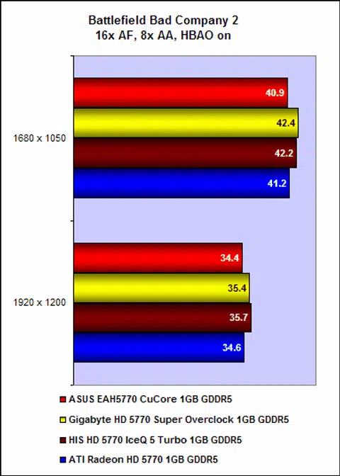 On Bad Company 2, we can see two distinct tiers of performance. Sporting identical clock speeds, the ASUS EAH5770 CuCore and the reference Radeon HD 5770 was slightly slower compared to the two overclocked cards from Gigabyte and HIS.