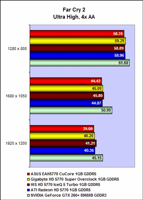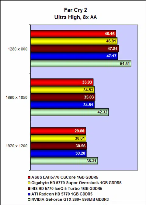 On Far Cry 2, it was more of the same. Even with its higher clock speeds, both the Gigabyte and HIS cards were unable to post a convincing lead over the ASUS card and a reference Radeon HD 5770. To end, the NVIDIA GeForce GTX 260 was by far the quickest card and not surprising too with its wider memory bus and more processing power.