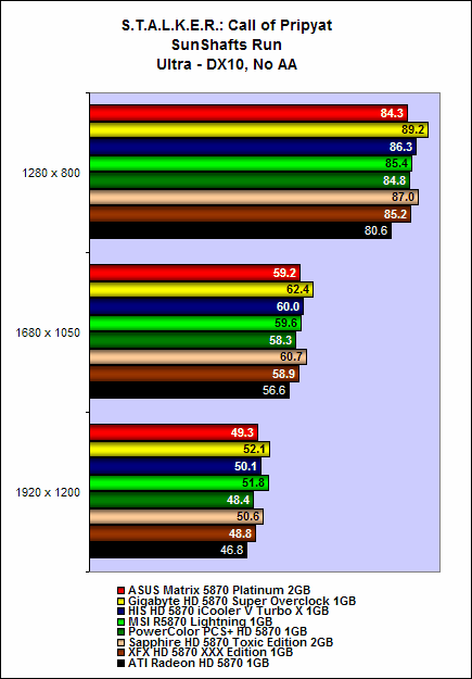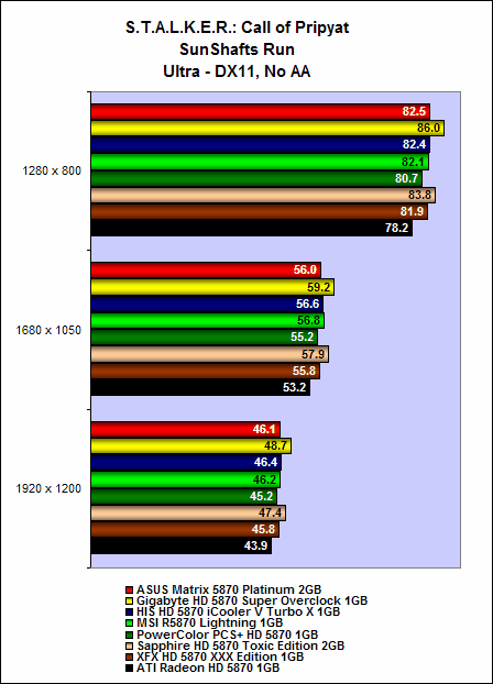 With its aggressive clock speeds, it wasn't a surprise seeing the Gigabyte HD 5870 Super Overclock snaring the highest scores on 3DMark Vantage. We also noted that the larger 2GB framebuffer on the ASUS Matrix 5870 Platinum and Sapphire HD 5870 Toxic Edition failed to give it an edge against its “lesser” 1GB brethren.