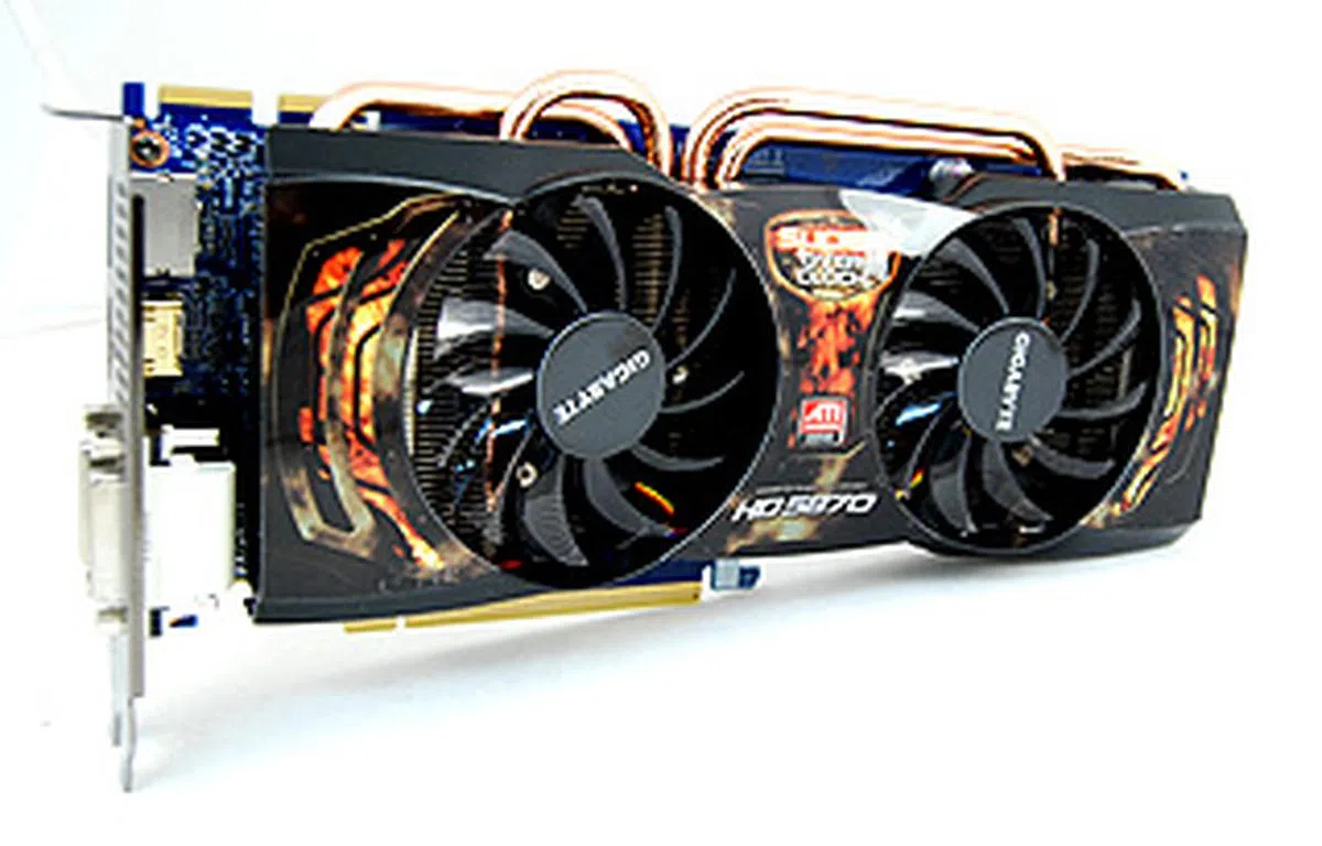 With its dual fan coolers and thick protruding heat pipes, the Gigabyte HD 5870 Super Overclock looks nothing like a reference card.