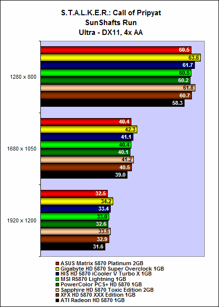 No surprises here as the Gigabyte HD 5870 Super Overclock once again emerged as the fastest card, albeit by the slightest of margins. The Sapphire HD 5870 Toxic Edition did well too, edging out the other slower clocked cards.