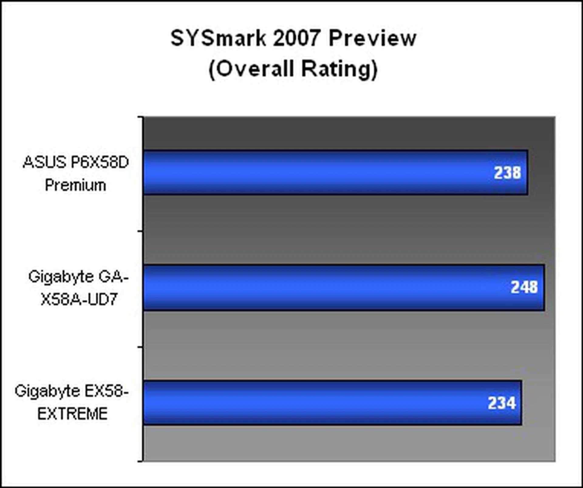It was a close outcome in the other system test suite, as the ASUS P6X58D Premium took a narrow lead over the Gigabyte GA-X58A-UD7. The reference Gigabyte board finshed third overall, though the difference was not as pronounced as the scores would suggest. With the exception of the Memories and HDD segments, all the boards were quite comparable. For those two segments, ASUS was clearly the better board, particularly for the HDD segment.