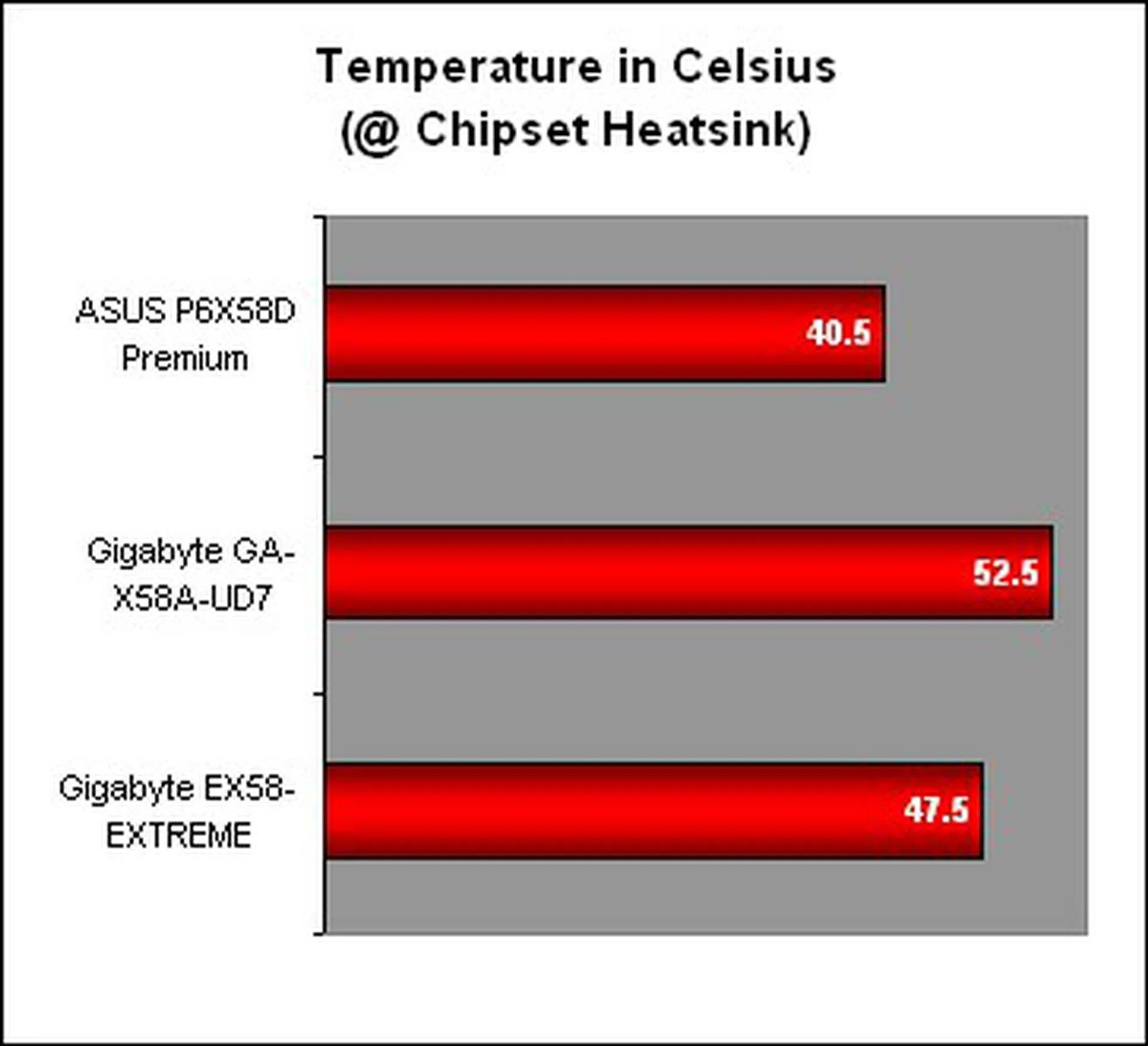 For the temperature section, we measured the temperature of the passive heatsink placed over the chipset die with a laser thermometer after subjecting the systems to an endless loop of 3DMark06. The ASUS was easily the coolest of the three here, with a reading that was more than 10 degrees Celsius lower than the Gigabyte UD7.