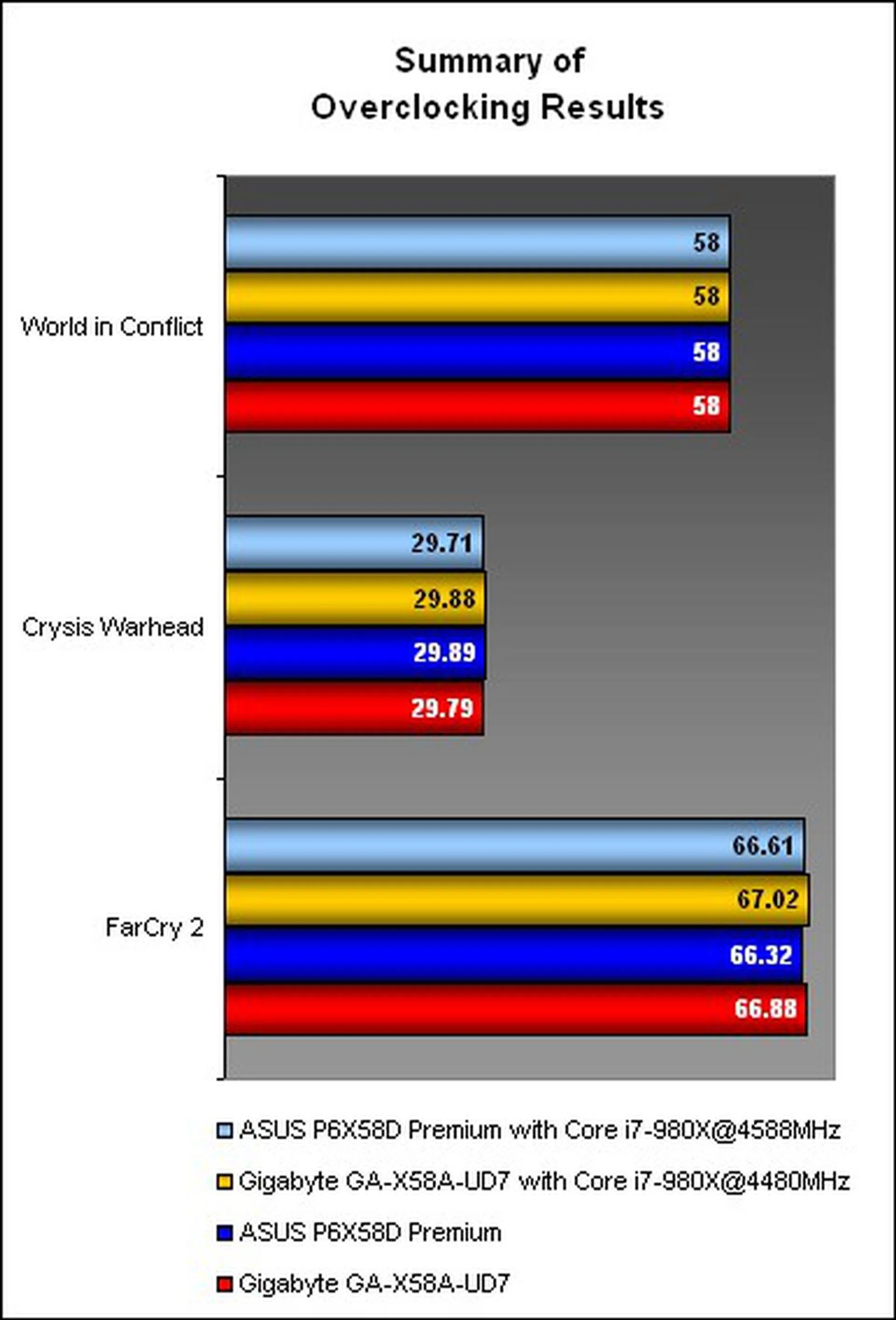 Unfortunately, as our graphics benchmarks showed, at our highest game settings, the bottleneck appeared to be the Radeon HD 5870 graphics card, as the increase in clock speed yielded practically no benefits at all. Even swapping over from the 5870 to a dual-GPU Radeon HD 5970 did not result in any improvement in scores from the overclock.