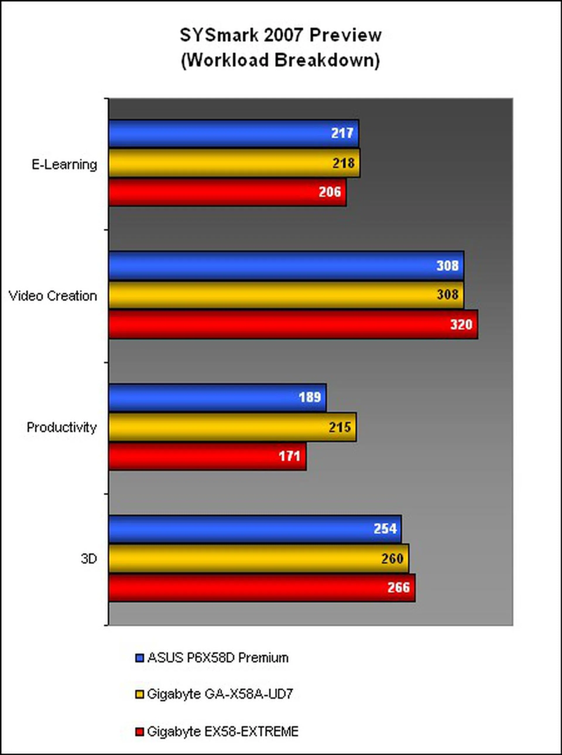The first benchmark, SYSmark 2007 had the newer Gigabyte board springing off to a good start. It edged ahead of the ASUS and the reference Gigabyte EX58-EXTREME by some distance. Its main strength however appeared to be in the Productivity segment, where it pulled away from the competition.