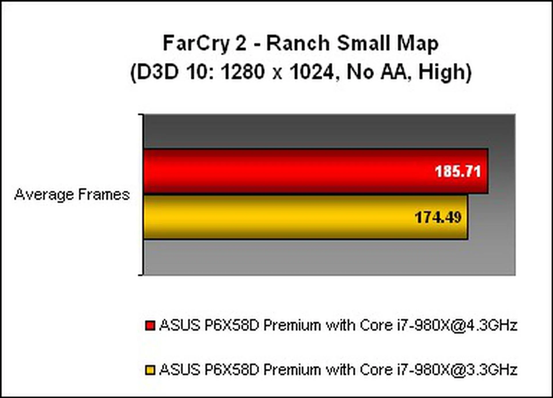 To confirm that it is indeed a case of GPU limitation, we lowered the settings in Far Cry 2 for one test with the ASUS board (the second graph below) and found that the scores did go up with the overclock, but only at the lower settings/resolution. It goes to show that no matter how many cores you have or how fast the CPU clock, at the highest settings, the graphics card is the decisive factor and there's still plenty of room for improvement for GPUs at this level.