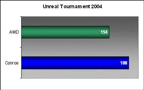 Unreal Tournament 2004 may be a very old benchmark, but it still seemed to scale pretty well with new generation PCs. For UT2004, the Conroe machine had a 22% performance lead over the FX-60. Intel's demo file used was named bots.demo4.