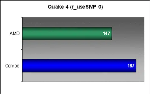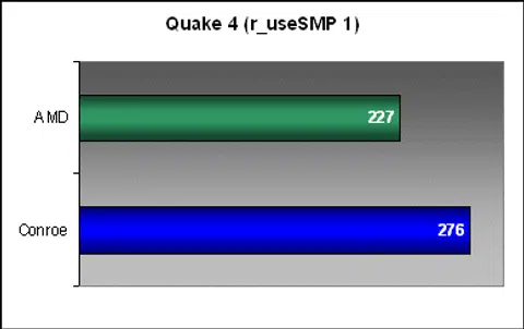 With the flag "r_useSMP" set to 1, Conroe scores were about 22% higher than the FX-60. With "r_useSMP=0" (single core performance), the Conroe PC managed to outperform the FX-60 by an even higher gap of around 27%.
