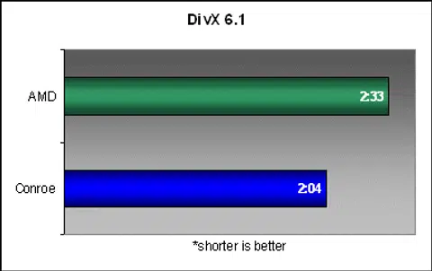 Our DivX encode test was run through XMPEG 5.0 with DivX's Insane Quality encode setting. Other settings were left at default. The Conroe machine completed the encode in two minutes and four seconds. This time, the FX-60 was almost half a minute slower than the Conroe.