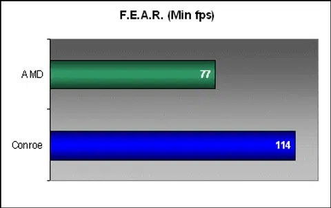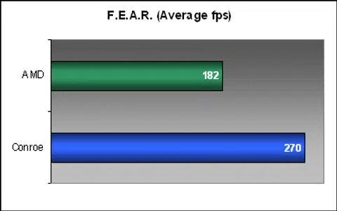 From all the benchmarks ran today, the Conroe test bed managed to best the overclocked FX-60 from anywhere between 20% to an extreme of 50% in the case of the average F.E.A.R. score. Yes, there are differences between the two machines that cannot be denied and we know that the RD480/RS450 solution is not the best platform to run an AMD system. But we are also experience enough to be aware that using a top-notch Socket-939 platform isn't going to improve the scores for the AMD processor by much at all.