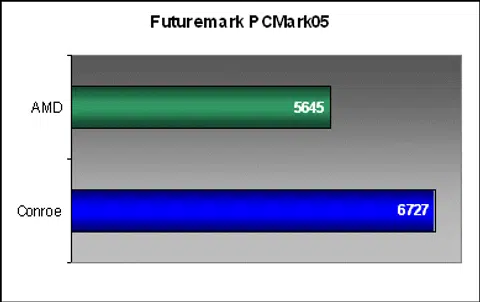 Although we were strapped for time, we managed to kick off PCMark05 while Intel was busy preparing to pack up, though we only managed to do a CPU run. The numbers speak for themselves. The Conroe PC came in at an impressive 6727 CPU 'Marks', outperforming the FX-60 slightly shy of 20%.