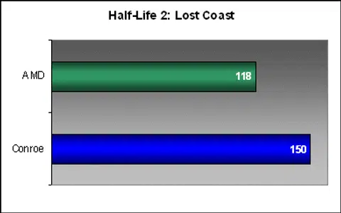 For Half-Life 2: Lost Coast, again we were running at 1024x768 with all details set to High in the Advanced tab. HDR and AA was not enabled however and standard Trilinear filtering was used. Again, HL2 benchmarks were run twice, the first time for caching and only the second round scores were recorded. What we noticed though was that the Conroe PC seemed to suffer from load issues, though we were told that this was due to the fact that Intel still hasn't optimized and worked out some of the storage driver bugs yet. However, even as the Conroe system loaded up the map a few second after the FX-60, it finished the benchmark way ahead. The Conroe machine only took 45 seconds to complete the benchmark run, while the FX-60 seemed to chug along to complete after 57 seconds. For those who are interested, Intel seemed to be using a custom demo file - pcba_lost_coast.dem.