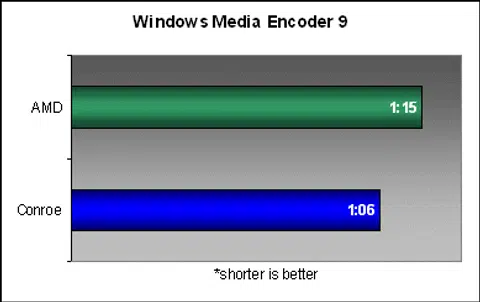 For Windows Media Encoder 9, we took a two-minute MPEG2 file and compressed it using a single pass CBR for both audio and video. Audio settings chosen was WMA 9.1 codec, 32kbps, 32KHz, Stereo. Video compression was under the WMV9 Advanced Profile, 240Kbps down to a 320x240 resolution video stream. The Conroe PC took about a minute and six seconds to complete the encode while the FX-60 came in around nine seconds later.