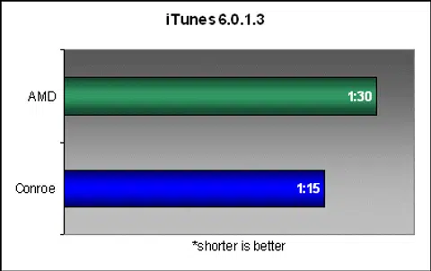 Lastly, we had an mp3 compression test using iTunes for encoding. The Conroe machine finished faster than the FX-60 by 15 seconds.