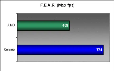 The maximum fps spike of the Conroe was slightly dubious though at 774fps, but then we rarely count high spikes since they usually only happen at rare occasions like when you're looking at a plain wall without anything behind.
