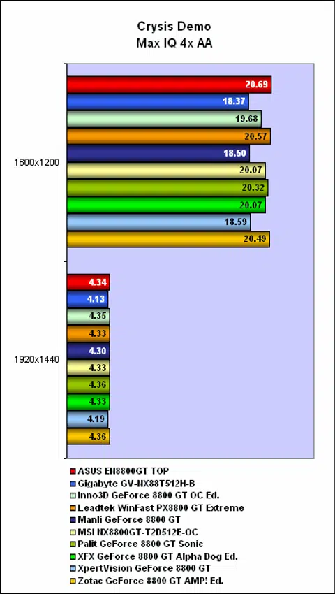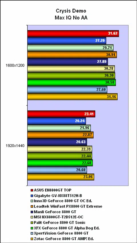 As you can see, with settings at maximum, Crysis can bring the GeForce 8800 GT cards down to their knees and any resolutions more than 1600 x 1200 will be barely playable. This is compounded when we enabled anti-aliasing within the game. Of course, this makes Crysis a stiff test for graphics cards and at these generally low frames, the overclocked cards show their value by producing two to three more frames than the standard. Again, the ASUS and Zotac are leading the rest, though the differences are probably more obvious at 'saner' resolutions than 1920 x 1440. Anti-aliased results at 1920 x 1440 look unusually low, but given the demo nature of the game used, this looks more like an anomaly and not something you should be alarmed regarding the card's performance.