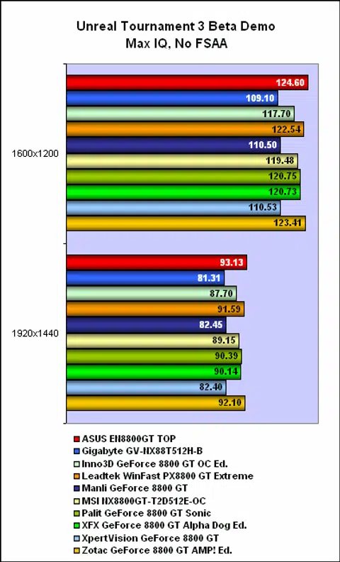 The cards all fared much better in Unreal Tournament 3 and even with anti-aliasing forced onto them, they managed healthy frame rates. Like in Crysis, the value of getting a faster overclocked card like the ASUS is not as obvious since the rest of the bunch were very close too.