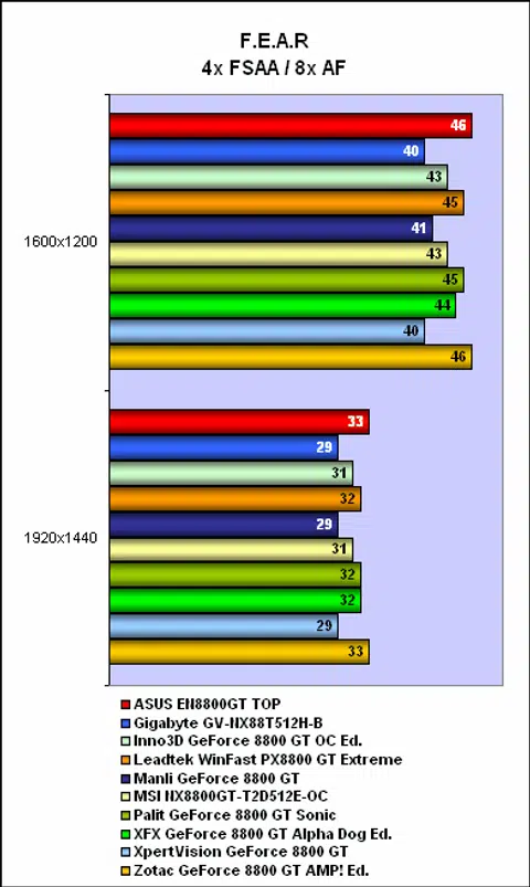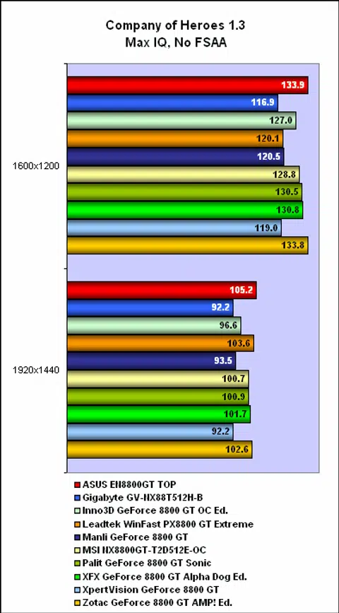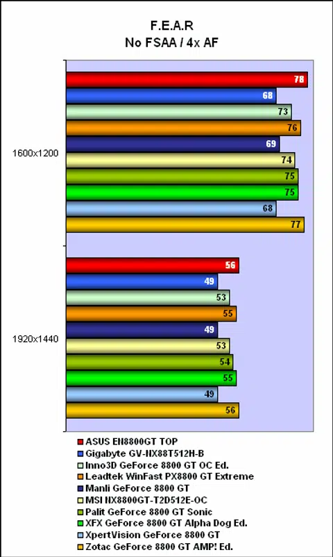 The ASUS and Zotac were the early front runners in Company of Heroes without anti-aliasing, though the Leadtek Extreme soon joined them in the leading pack. Most of the overclocked cards fared rather similarly and cards like the Palit, XFX and MSI were separated by less than a frame on many occasions. If you're wondering about the virtues of getting an overclocked version of the GeForce 8800 GT, we'll recommend getting one with a larger overclock in order to experience the actual in-game impact. For example, in F.E.A.R, such a difference between an overclocked variant compared to the standard could be as much as ten frames and as little as four, depending on the resolution and settings used.