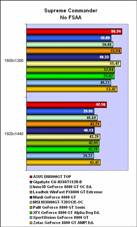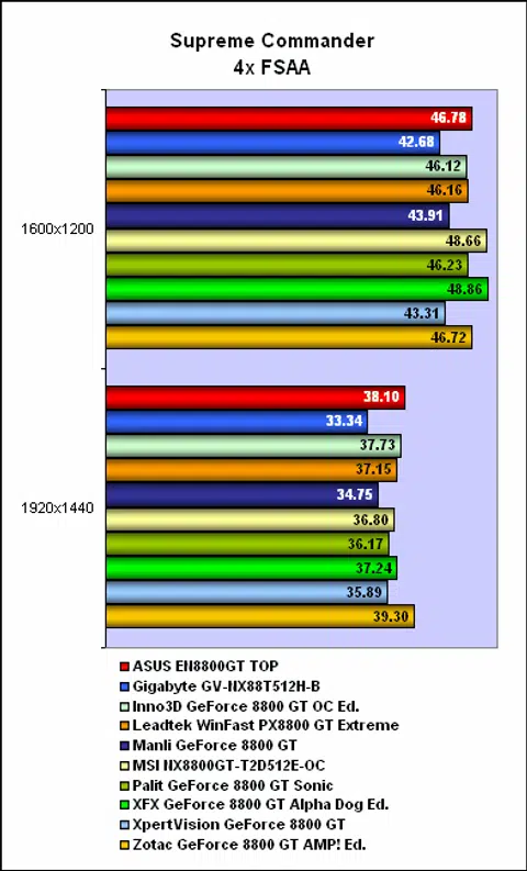 Due to the overwhelming numbers of units found in this real time strategy game and its epic scope, the CPU plays a rather significant role in this game, which is probably why even a strong performer like the GeForce 8800 GT will find it tough going at the higher resolutions. As usual, the ASUS remained one of the leaders here, while surprisingly, we found the Zotac slightly falling behind. This could be attributed to the slightly slower stream processor clock on the Zotac, 50MHz behind the ASUS. Mostly though, it is ASUS leading the way with Leadtek, Zotac and occasionally, XFX and MSI getting ahead of them.