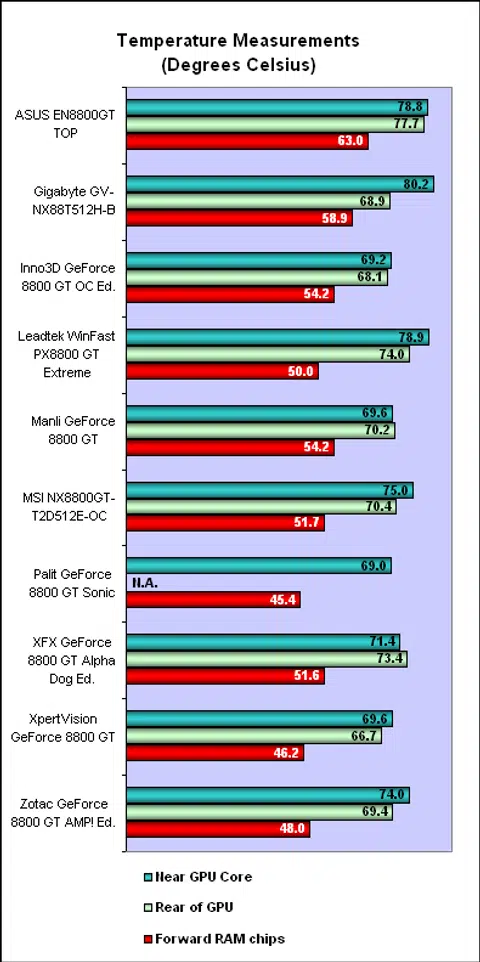 Hot and hotter seems to be the prevailing sentiment for the GeForce 8800 GT cards in general and with so many overclocked cards in our roundup, it's bound to get worse. Predictably, the worst culprits are those with higher clocks and while their performance is certainly fast, the temperatures of cards like the ASUS, Leadtek and Zotac were also correspondingly high. Surprisingly, the Gigabyte card also ranked among the hotter cards, despite its standard clock speeds. With core temperatures averaging around 70 degrees Celsius in our air-conditioned lab, the GeForce 8800 GT is not a graphics card you will buy without careful consideration of your case ventilation. Going for a third party cooler may well be the choice for most and Palit's example here is worth looking into, since its non standard two-slot cooler did manage to snare a lower temperature reading than most of its peers, and in spite of being overclocked too.