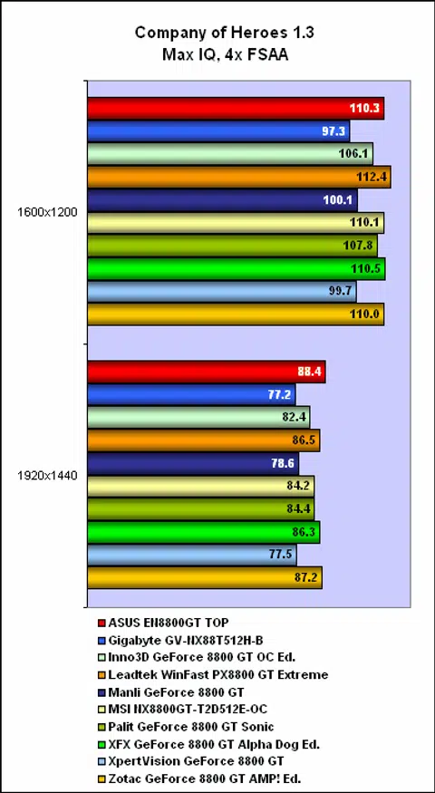 - It's the ASUS TOP Edition and obviously that means high clocks and in the case of the GeForce 8800 GT, even higher temperatures. These clocks help to ensure that for most of our benchmarks, the ASUS was right there at the top. The manufacturer has spared no expense on this premium edition and the new Company of Heroes expansion should be welcomed by most RTS playing consumers. With an estimated retail price of S$469, it is no doubt one of the more costly GeForce 8800 GT cards out there in the market but it could be well worth the price if guaranteed overclocking together with an extended 3-year warranty is what you're looking for. Besides, if you can wait a little, the revised TOP edition with a Glaciator cooler and custom PCB may be available shortly and that could prove to be an even better choice.