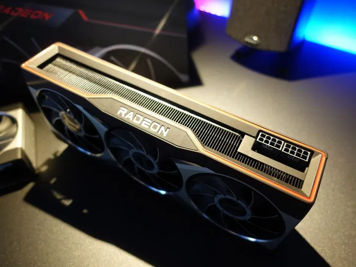 AMD has ditched the lateral blower design of the previous generation in favour of a triple-fan axial airflow design. Three 80mm fans blow air onto a dense aluminium fin-stack heatsink. The card has a total board power (TBP) of 300W. Two 8-pin connectors are located at the PCB edge's, what AMD is calling "Edge Cable Management", which is quite a big deal if you recall the awkward power connectors location on the RTX 30-series Founders Edition cards.