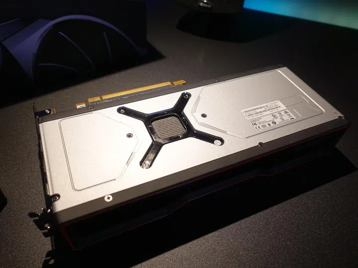AMD's RX Radeon 6800XT will occupy about two and half PCI slots. The heatsink underneath is thicker, to cope with the higher TBP (total board power) of this card.