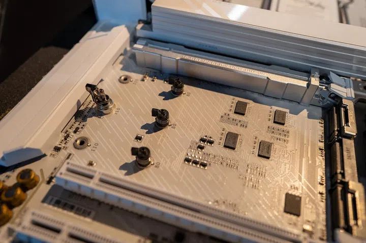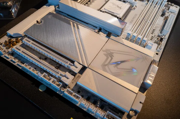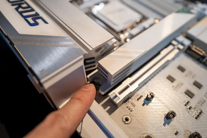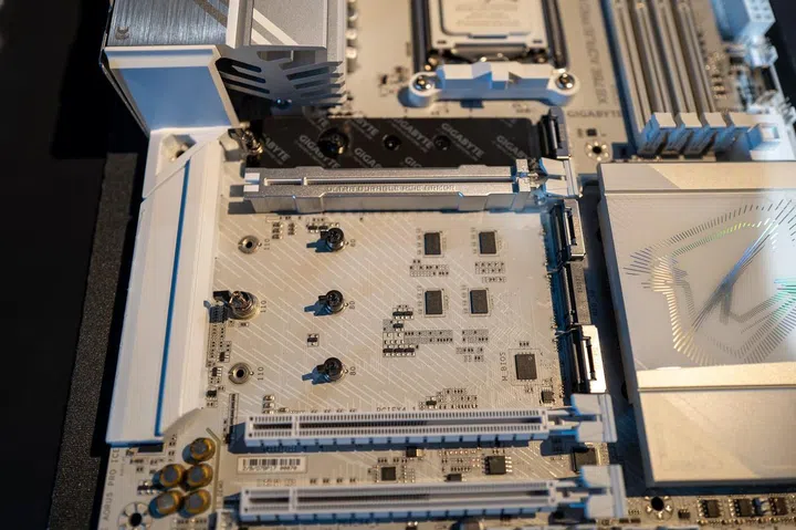 The X870E Aorus Pro Ice has a huge one-piece M.2 heatsink that features a tool-less design called M.2 EZ-Latch Click, which makes removing and installing the said heatsink really easy.