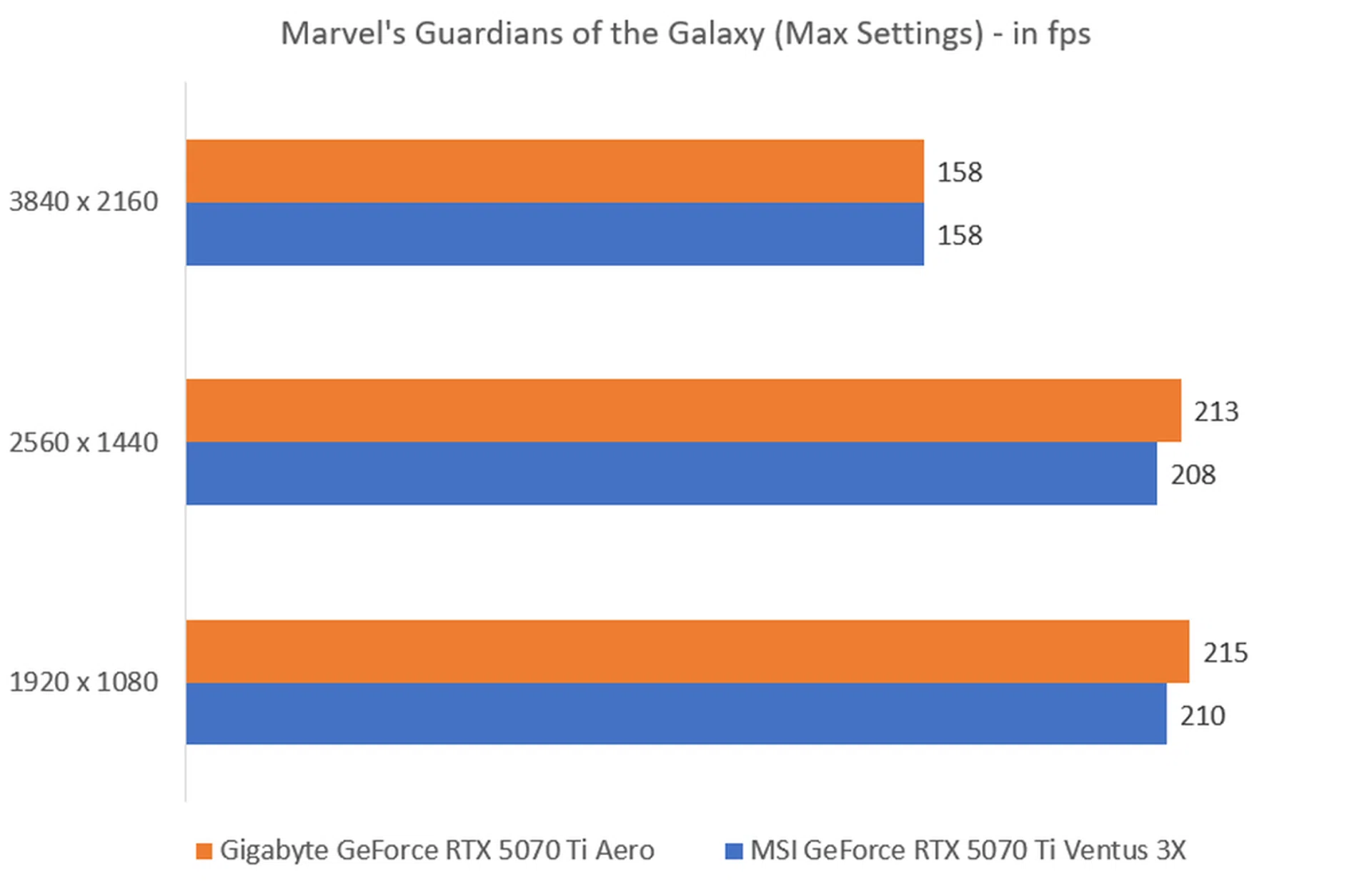 That the Gigabyte RTX 5070 Ti Aero card consistently beat our NVIDIA RTX 5070 Ti's reference card from MSI in our gaming benchmarks is not a surprise. In fact, you could even say it had to, considering it has a slightly higher boosted clock speed. Interestingly, I'd thought that the performance differences between both cards would be marginal at worse, but games like Total War: Warhammer III and Marvel's Guardians of the Galaxy saw a spike in 1080p and 1440p performances in favour of the Gigabyte's card.