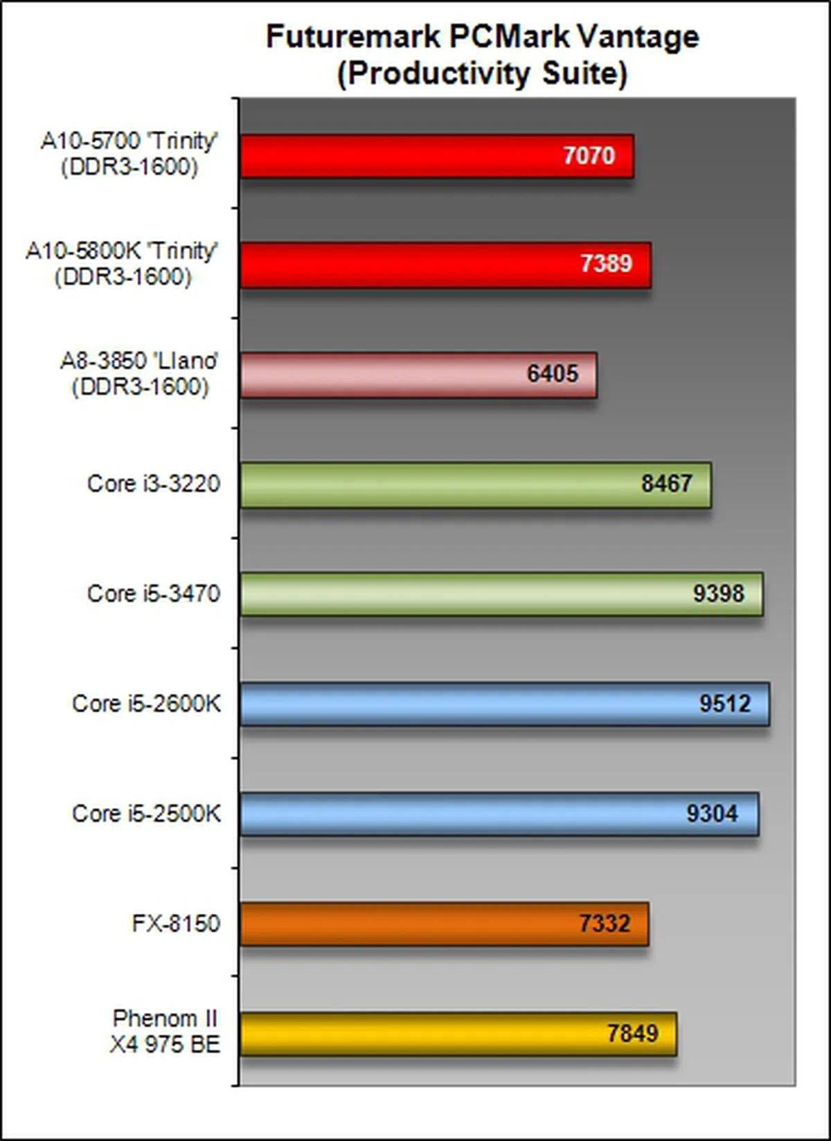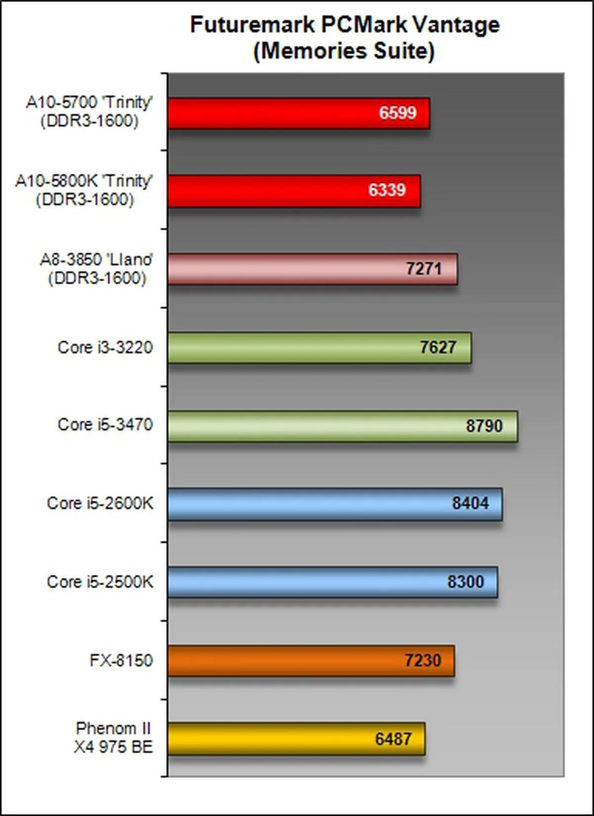 To measure the system's performance across a wide variety of common tasks such as photo viewing, photo editing, video, music and productivity, we made use of our trusty PCMark Vantage benchmark to gauge the performance of a processor. For the benchmark's overall score, the AMD A10-5700 trailed behind the A10-5800K by a margin of 8%; as a whole, the Trinity APUs performed at a higher par than their main competitor, the Intel Core i3-3220, by pulling ahead with margins in the range of 3.2- to 11.5%. An anomaly is observed in the Memories Suite results, as the A10-5700 pulled ahead of the A10-5800K by a margin of about 4%.