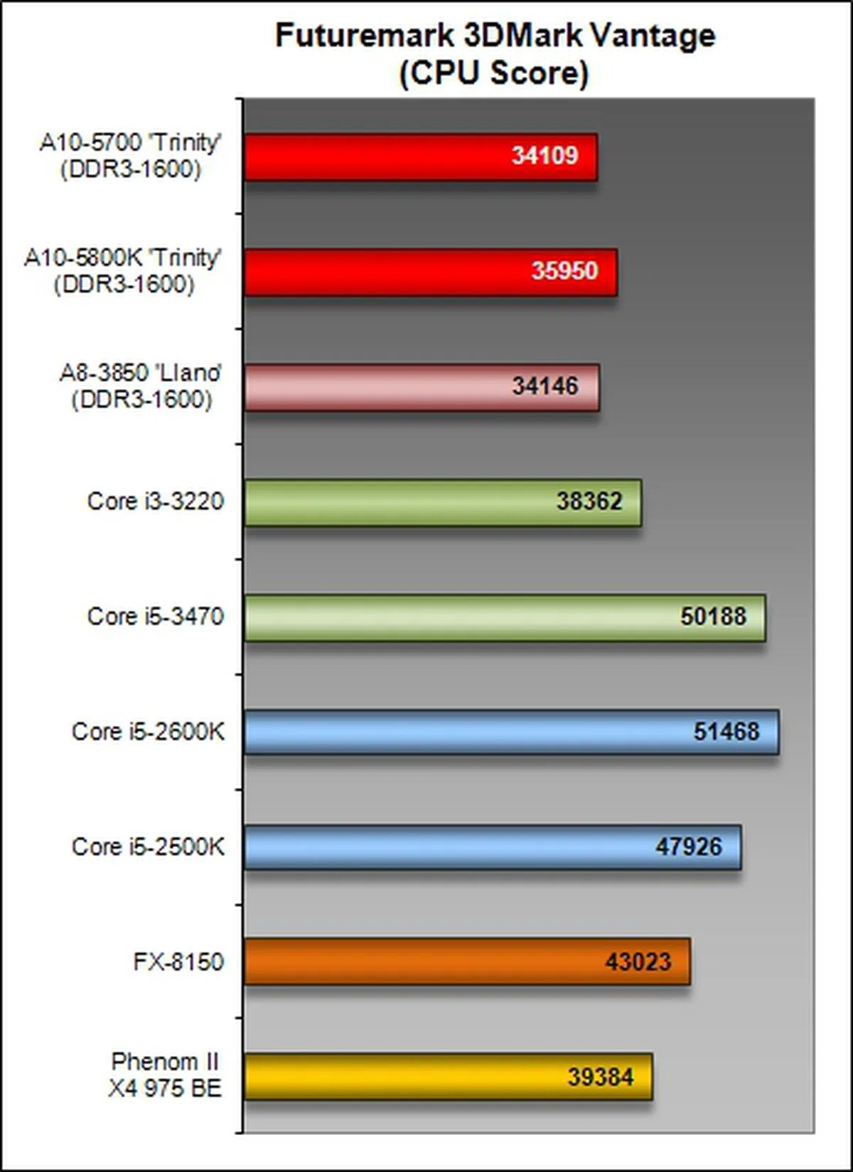 3DMark scores are looking pretty rosy for even the integrated graphics performance on the A10-5700 as it's just 4.7% off from its A10-5800K brother. This means, it still delivers firepower that can almost match a GeForce GT 440 discrete graphics card and is notably speedier than any other processor's integrated graphics performance.