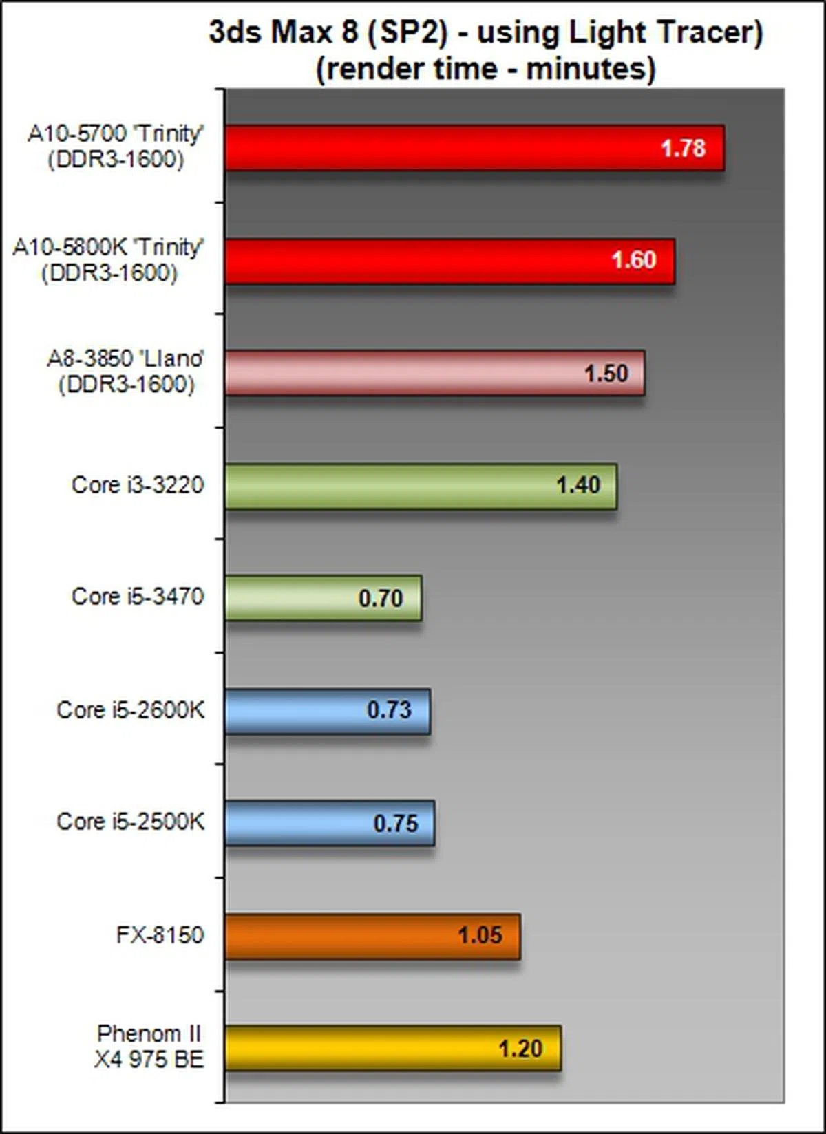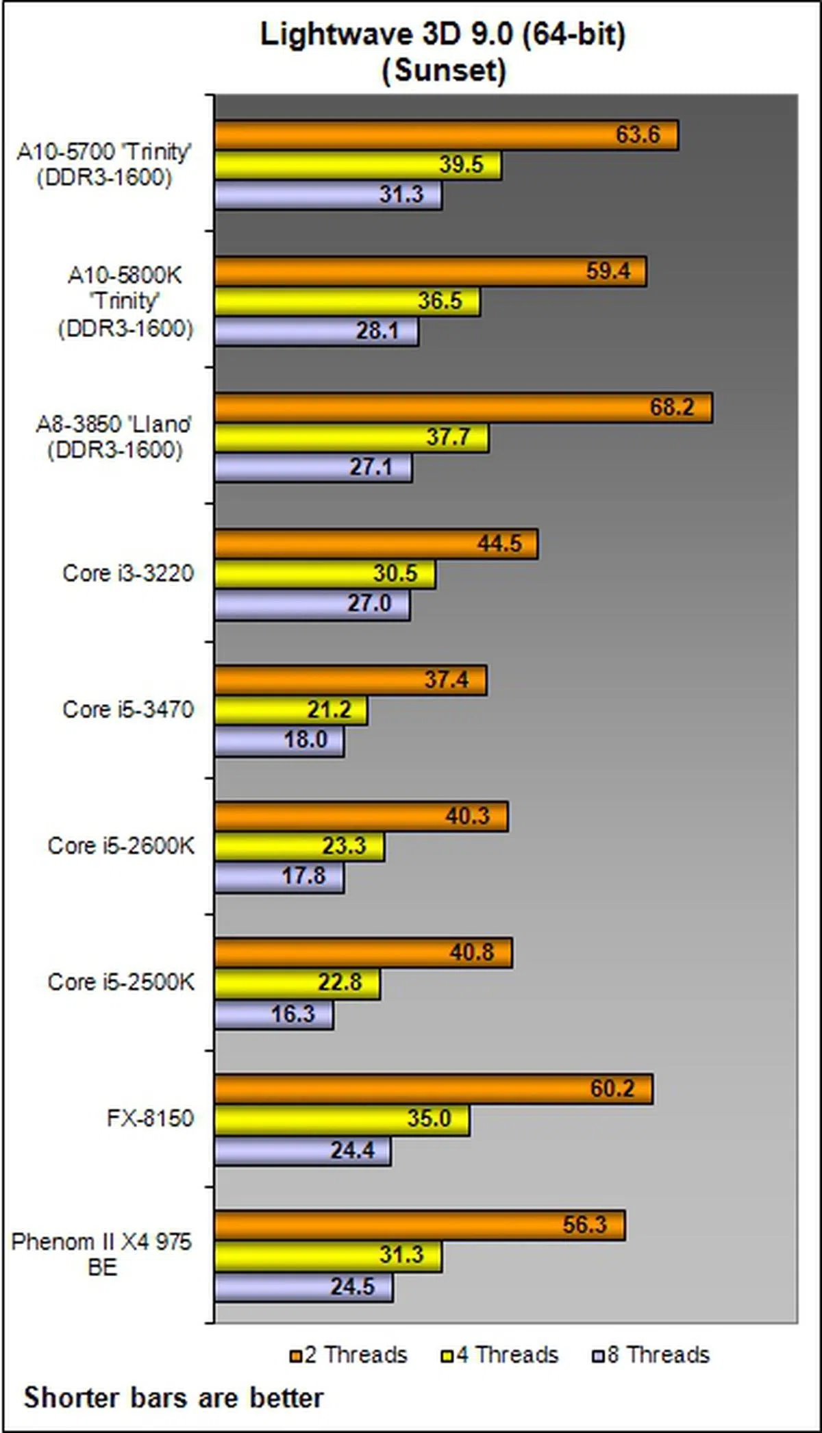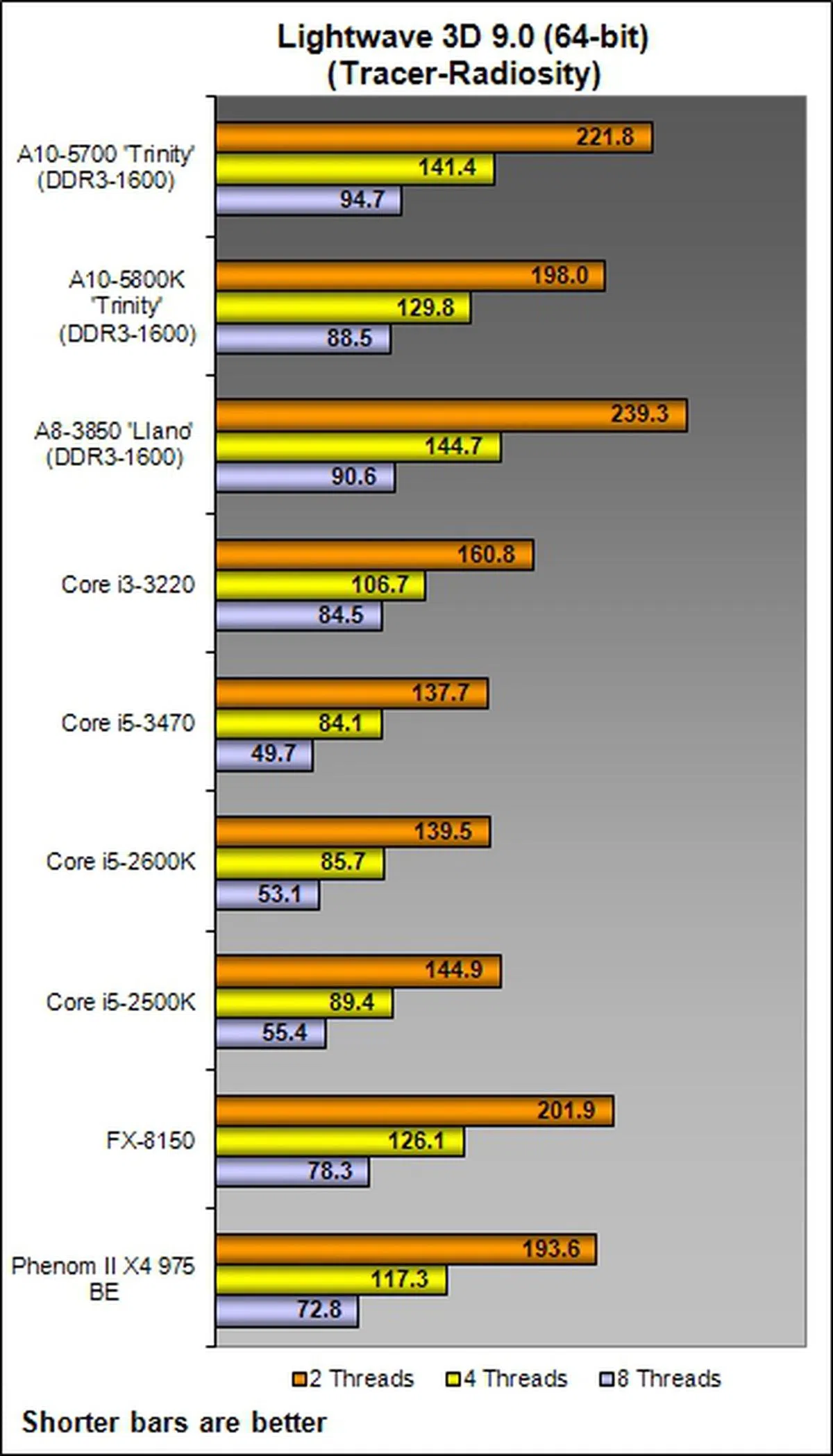 Performance on Lightwave 3D was in-line with what we had witnessed earlier in the SYSmark 2007 benchmark as the A10-5700 only managed to outclass the previous generation Llano APU - barely. In some test situations like the 4- or 8-thread runs, the A10-5700 actually ranks in slower than the best Llano-based desktop APU.