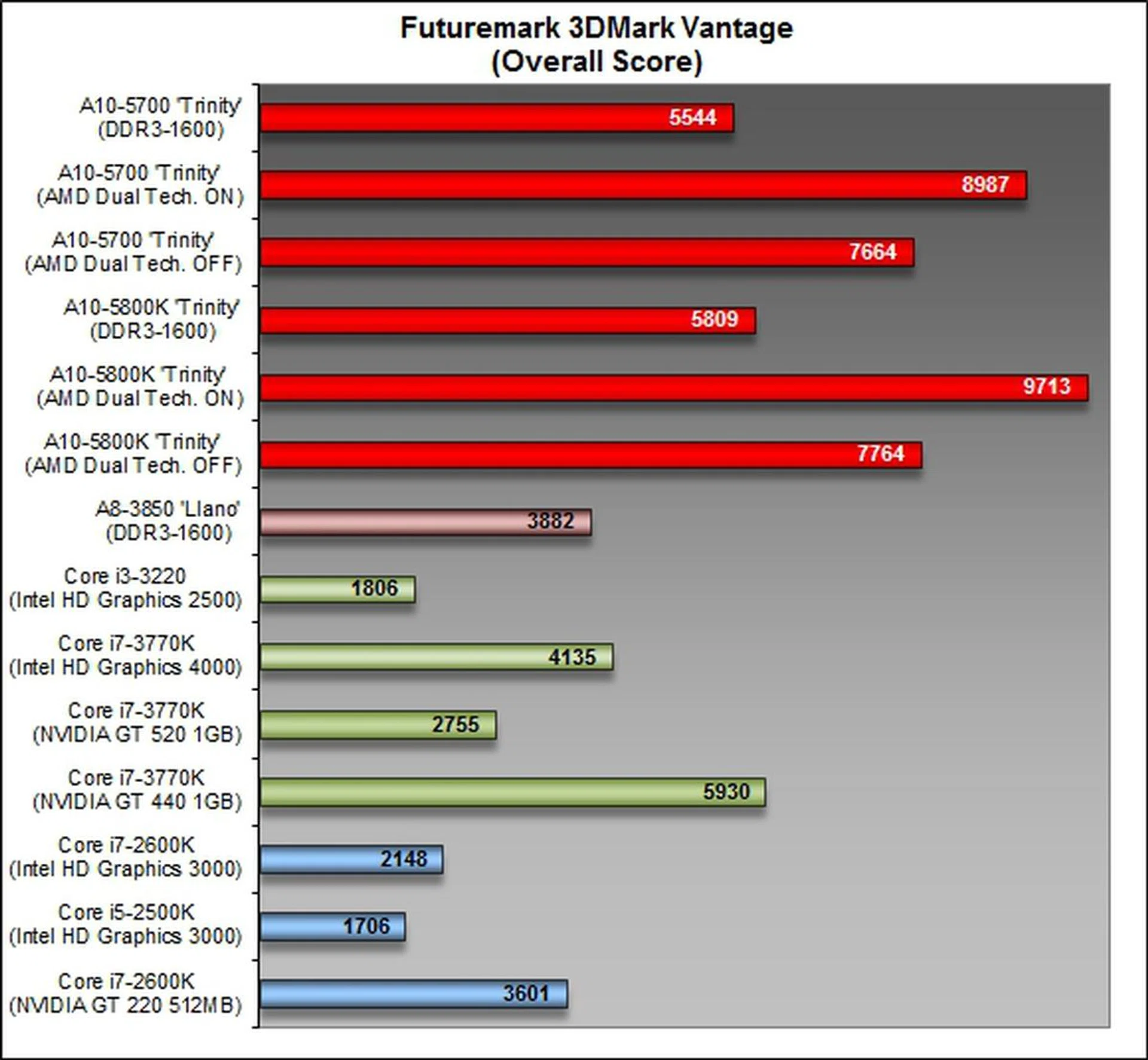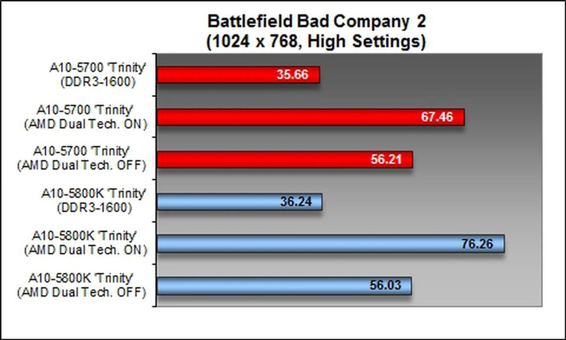 With the AMD Dual Graphics technology turned on, the graphics performance of the A10-5700 was boosted by about 17% as compared to the score achieved when AMD Dual Technology was turned off, i.e., the APU was running off the Sapphire Radeon HD 6670 discrete graphics card without the support of Dual Graphics. Overall boost from this pairing is slightly over 62% against just the Trinity GPU's own capability.