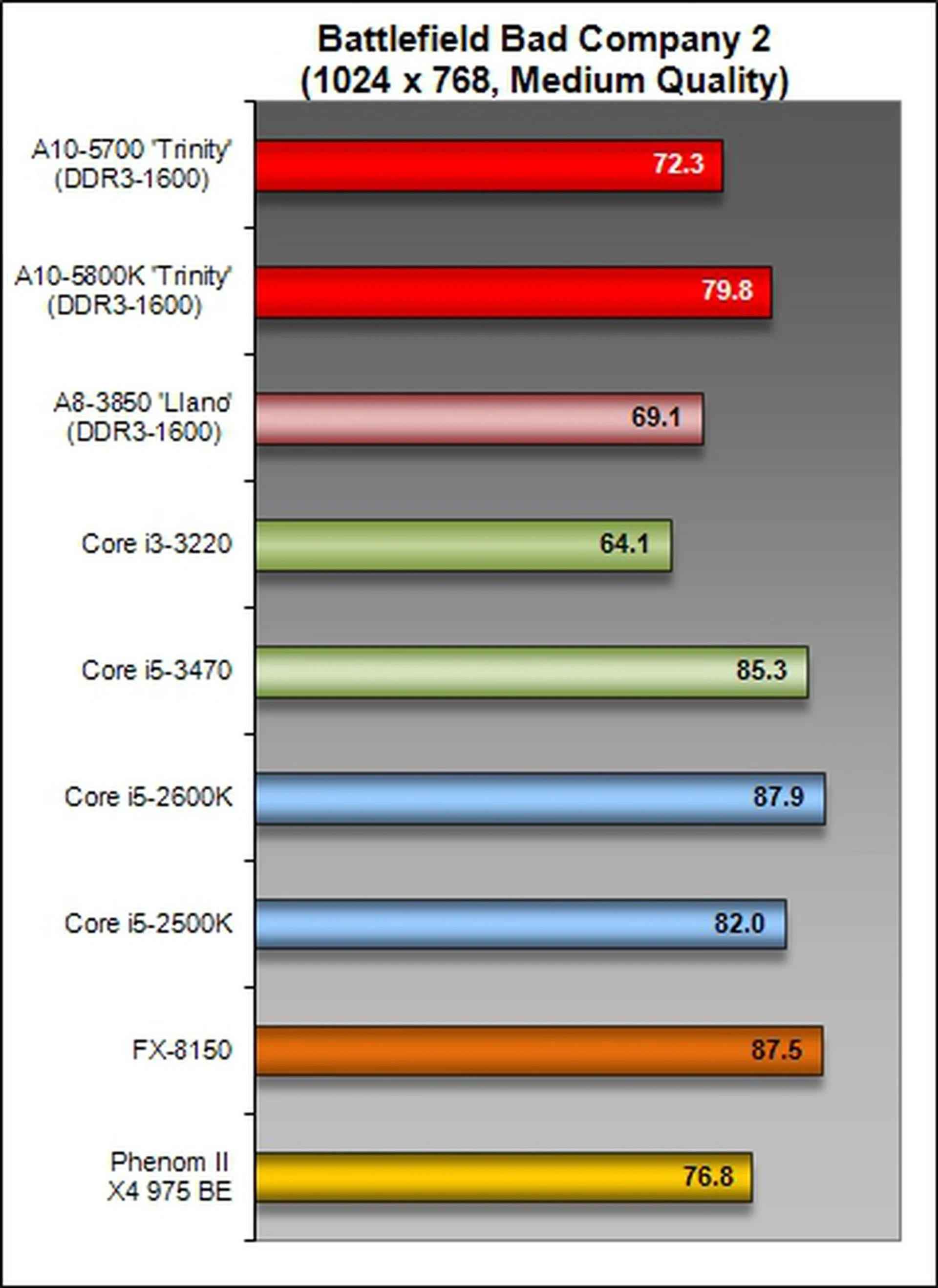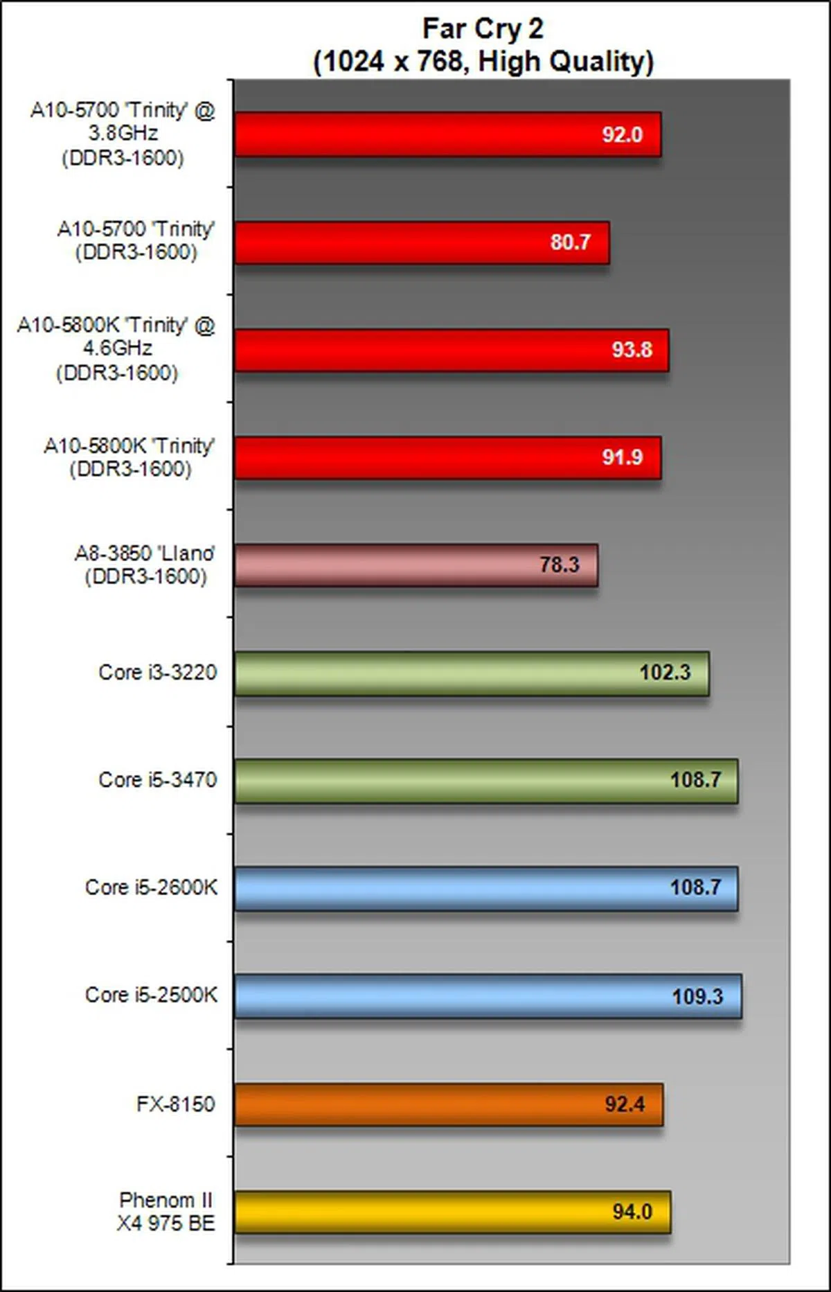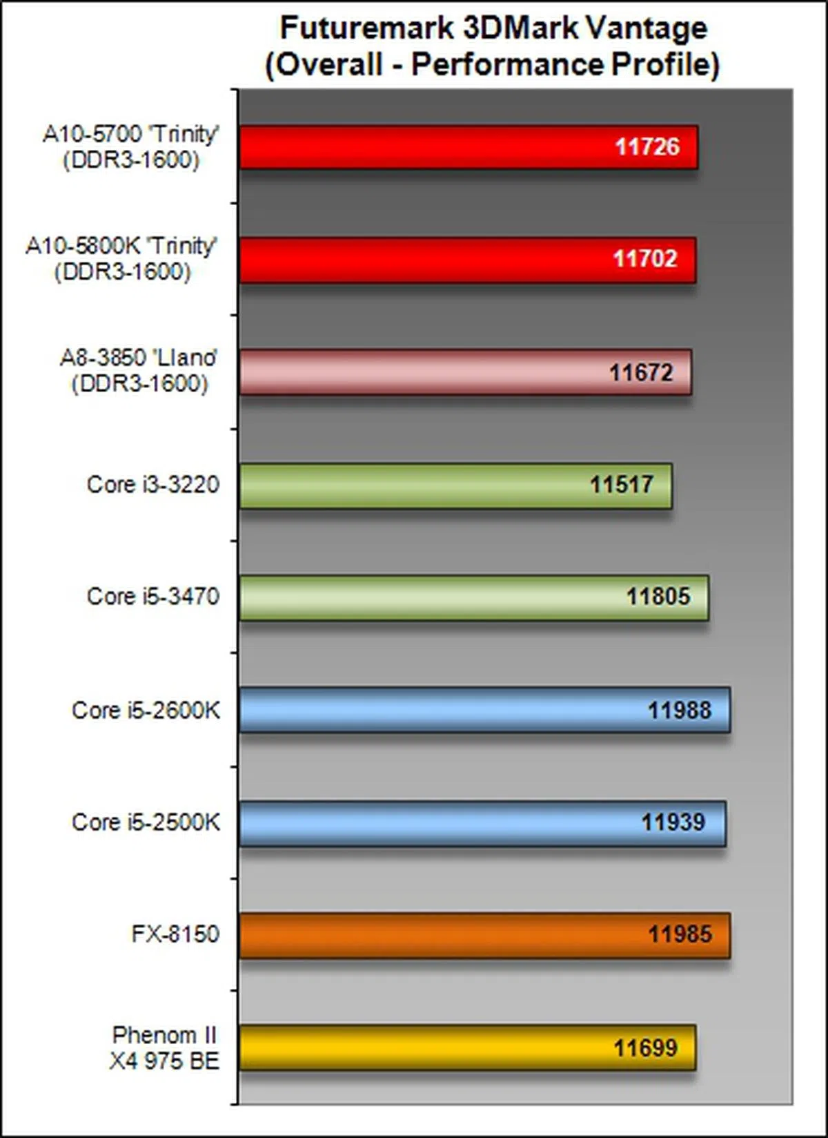 On the other hand, this DirectX 11-supported gaming benchmark switched tables somewhat and gave the AMD APUs a lead in its competitive class of processors. The A10-5700 turned in a better performance against the Llano and Intel Core i3-3220 processors.