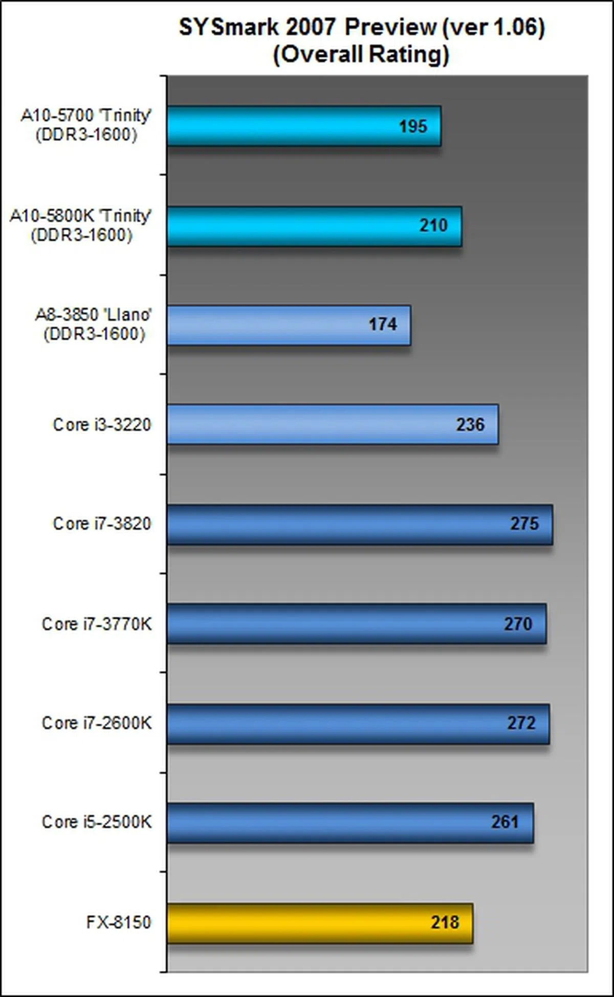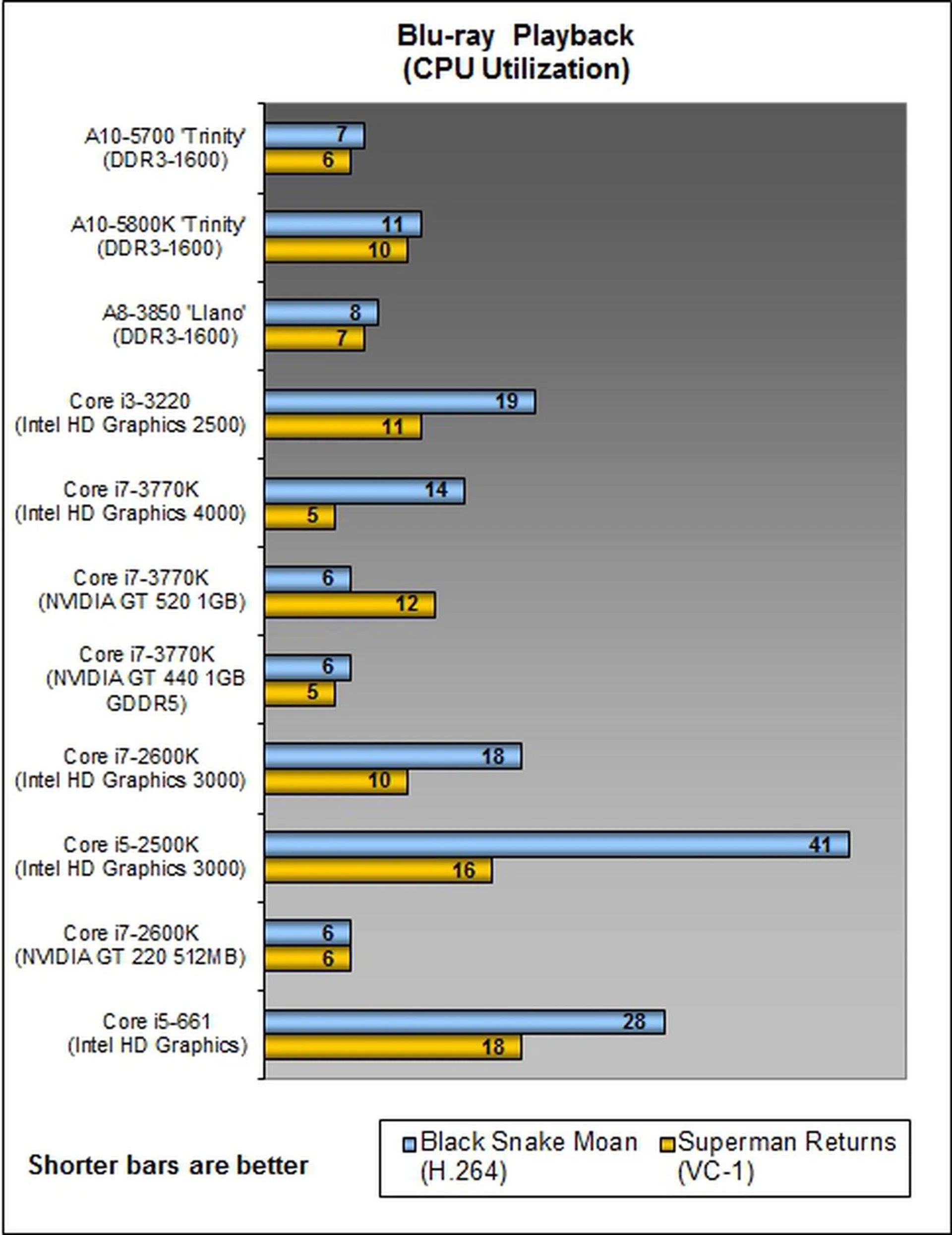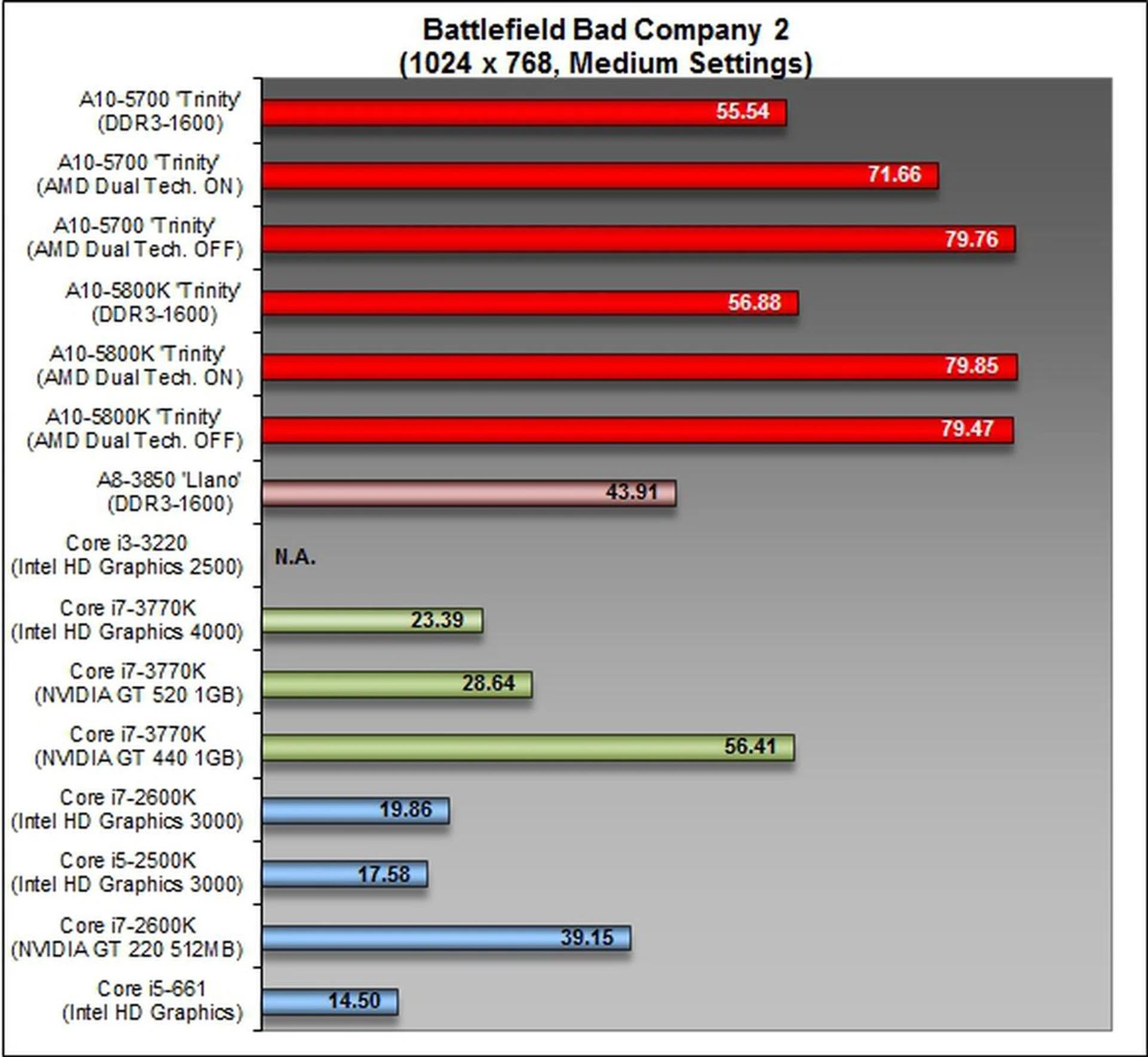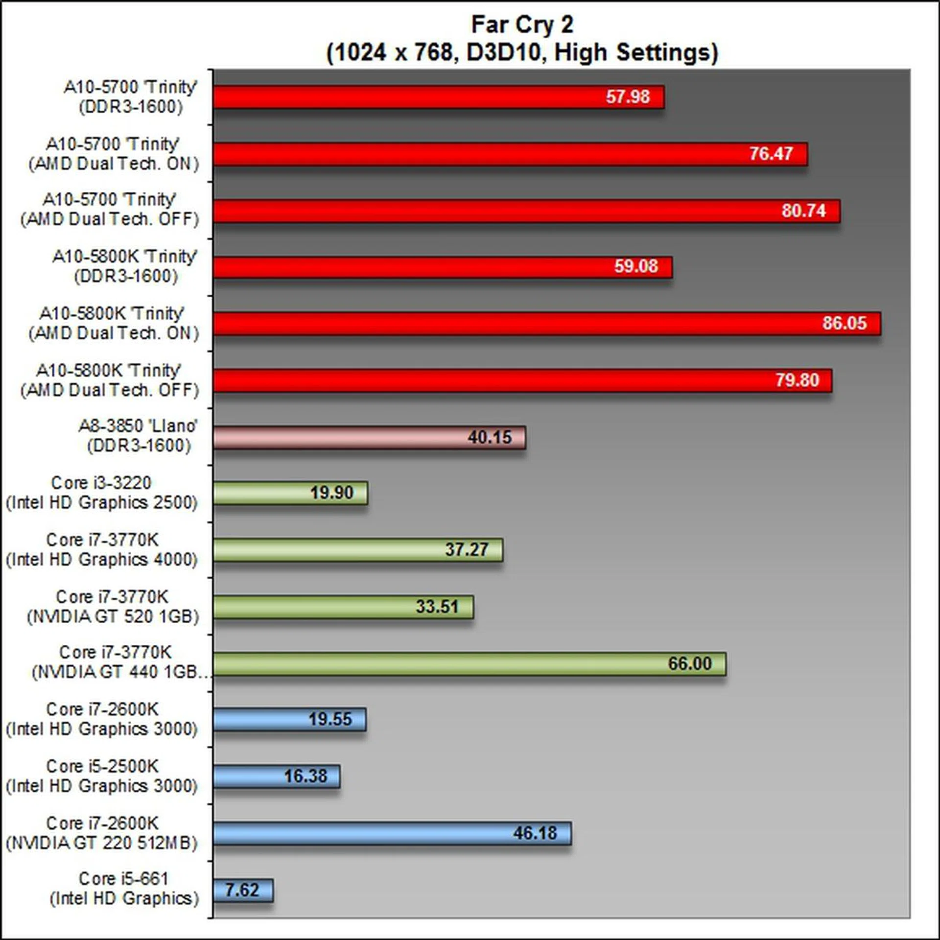 On the other hand, this DirectX 11-supported gaming benchmark switched tables somewhat and gave the AMD APUs a lead in its competitive class of processors. The A10-5700 turned in a better performance against the Llano and Intel Core i3-3220 processors.