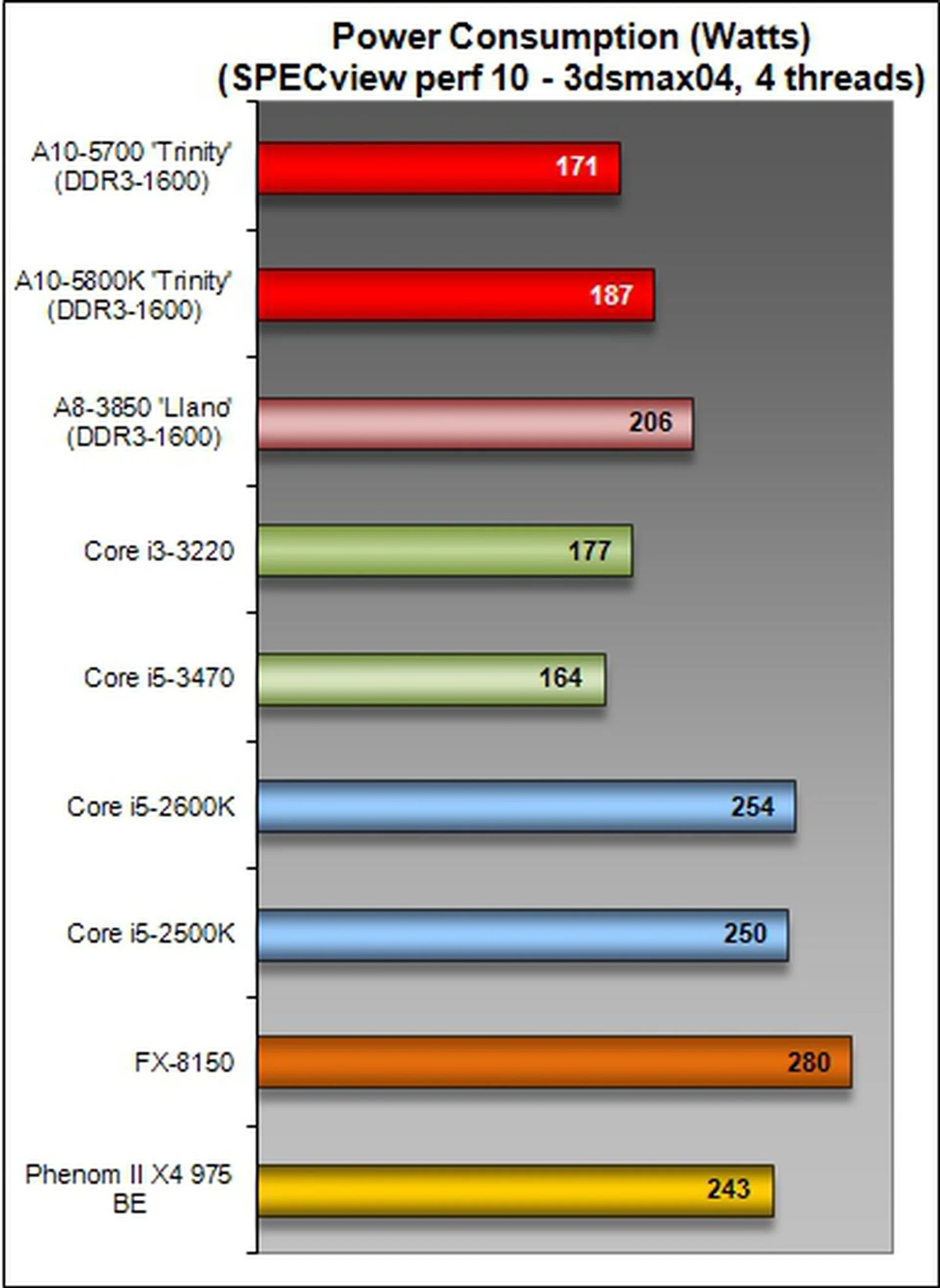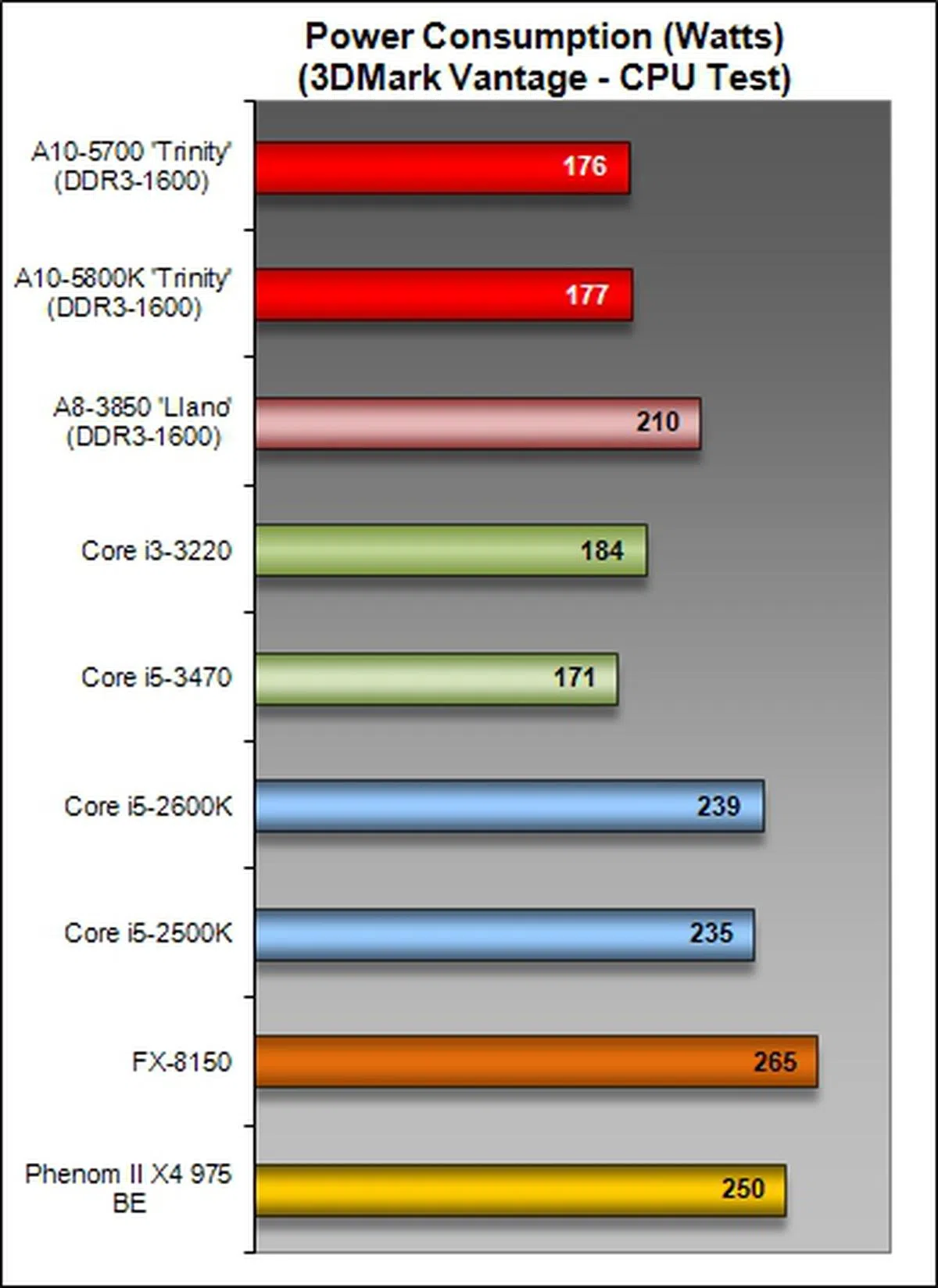 On this test, we're back to utilizing a discrete graphics card to control all possible variables. Although the A10-5700 is rated at 65W TDP, its idle power draw registered higher at 83W than that of the A10-5800K. Do note that the A10-5700 was tested on a different board from the A10-5800K due to a technical glitch. At load testing, we saw less influence of the motherboard and actually noticed slightly better power consumption figures that are better in-line with our expectations.