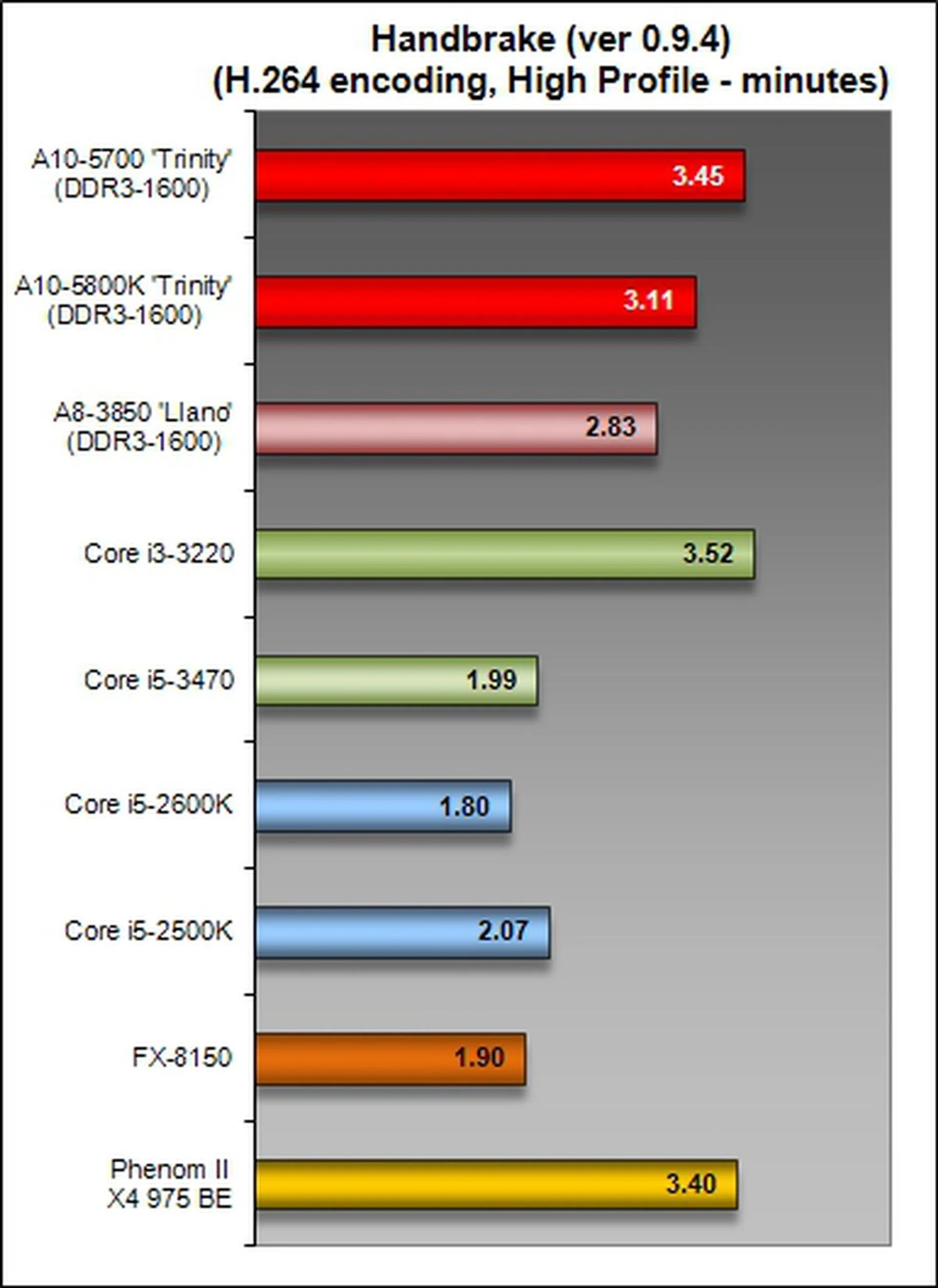 On Handbrake, the performance turned in by the A10-5700 was in line with expectation as with the anemic sub-par achievement by the top-end A10-5800K, it came as no surprise that the former took an additional 34 seconds to complete encoding our test video file. Both the Trinity APUs lost to their previous generation counterpart, the A8-3850 APU while outperforming the Intel Core i3-3220.