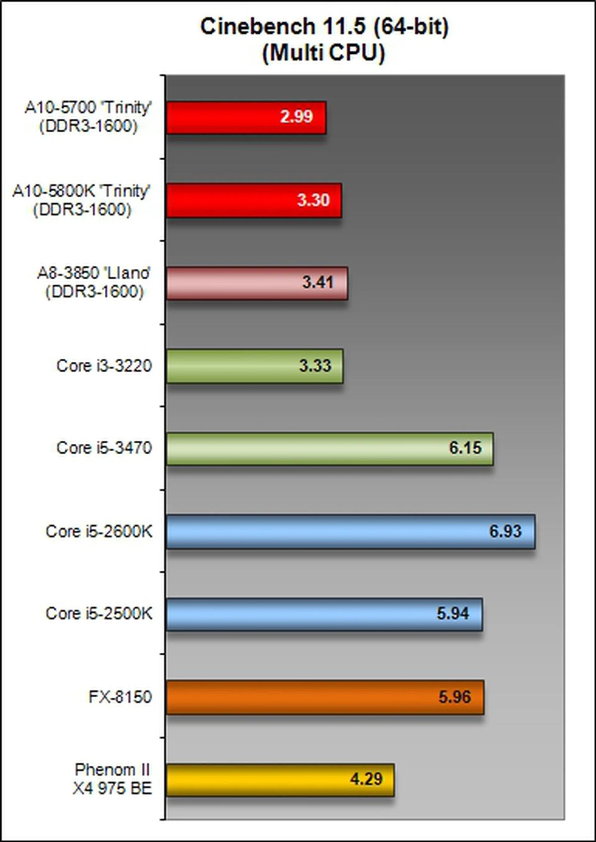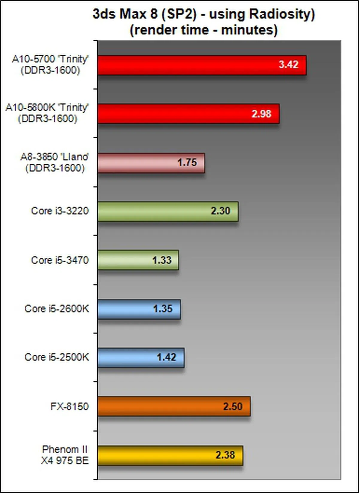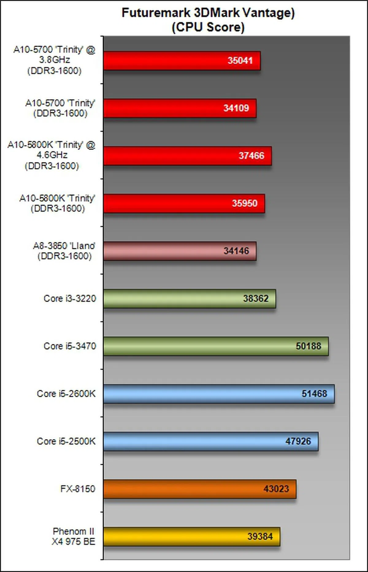 The Trinity APUs were outclassed in terms of their CPU compute prowess for this benchmark. Sadly, even the previous generation Llano A8-3850 APU put in better performance than the newer APUs.