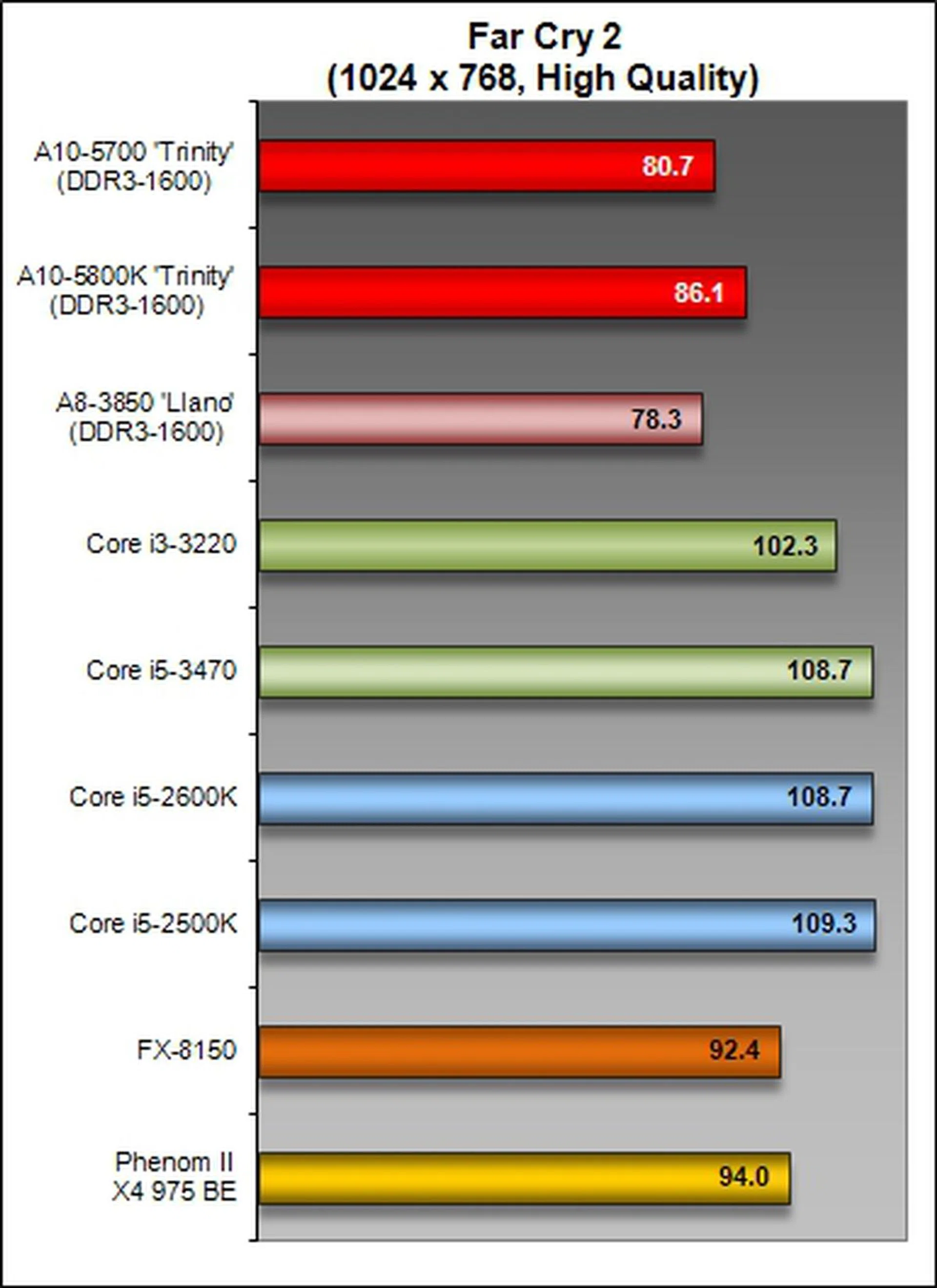Continuing the testing on the same discrete graphics card to check the influence of the platform in actual games, we found the the A10-5700 to outperform the Llano A8-3850 by a small margin of about 3%. The Intel platform fared much better on this benchmark, thus showing this game's reliance on the platform's throughput for better results despite using the same GPU.