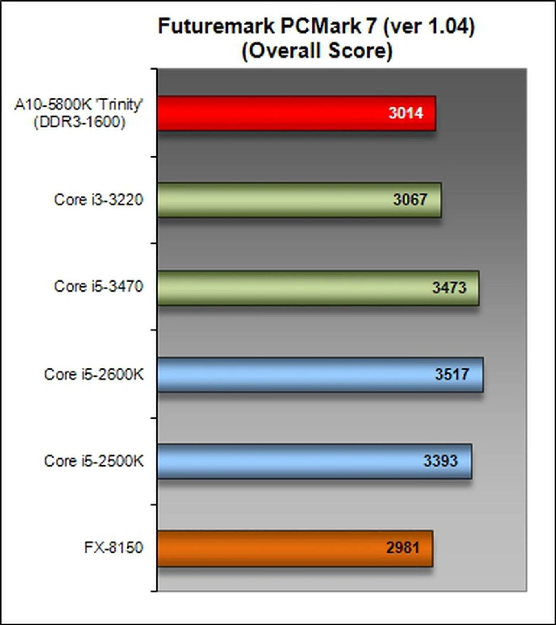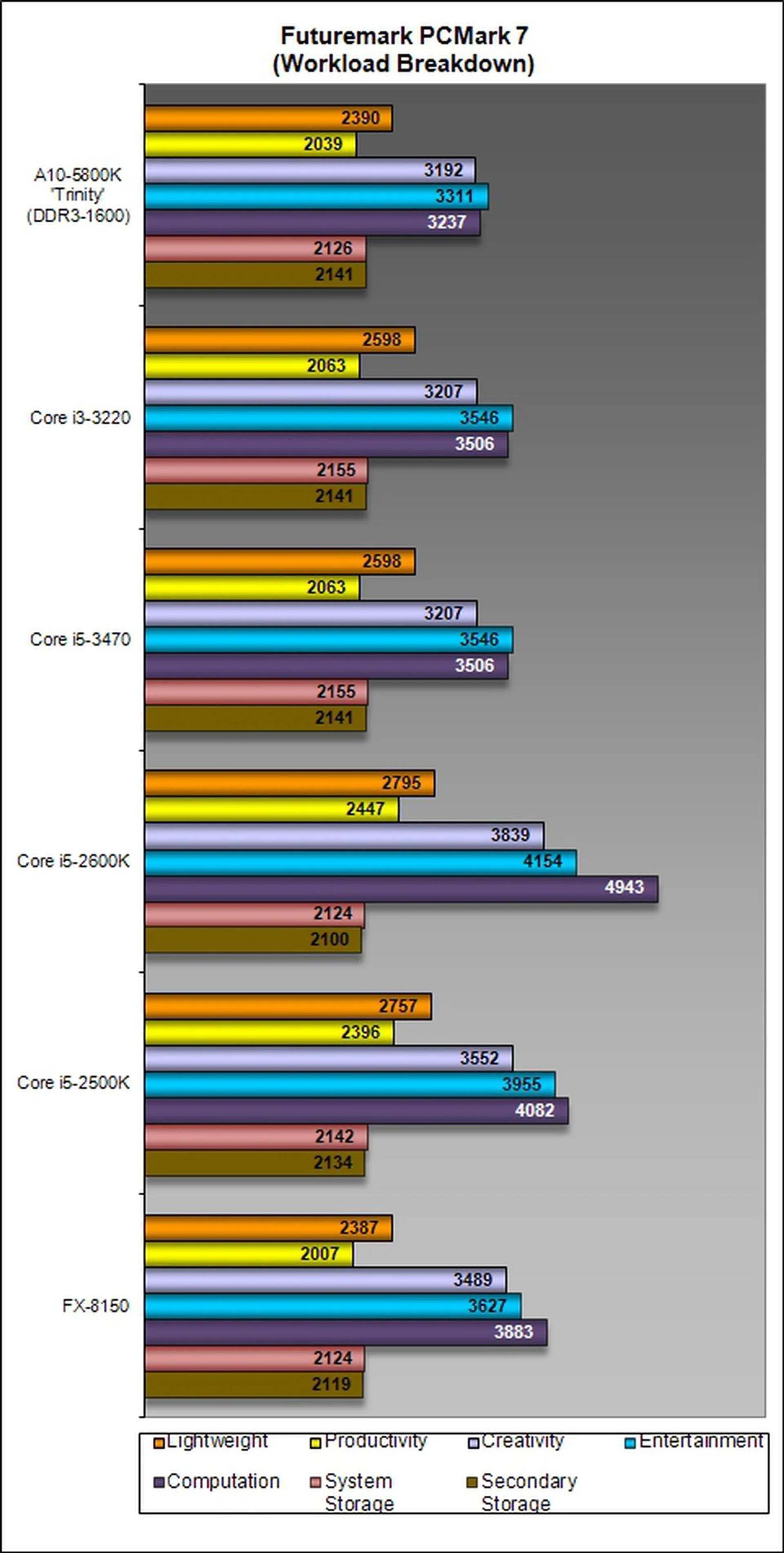However, all's not what it seems from the overall scores. Peering into the detailed breakdown of results of the AMD A10-5800K against the Intel Core i3-3220, you'll notice that the Intel counterpart actually managed a better performance margin in some of the more intensive tests (more than 8%) than the difference in the overall PCMark 7 score suggests. From that point of view, Intel's solution still maintains the marginal lead when all other factors are equal. This same discrepancy is again repeated when you study the Trinity APU's performance against the AMD FX-8150 where the latter actually rakes in much higher scores in the more processor intensive workloads like "Creativity", "Entertainment" and "Computation". The margin of difference can be as high as 20% to the FX-class processor.