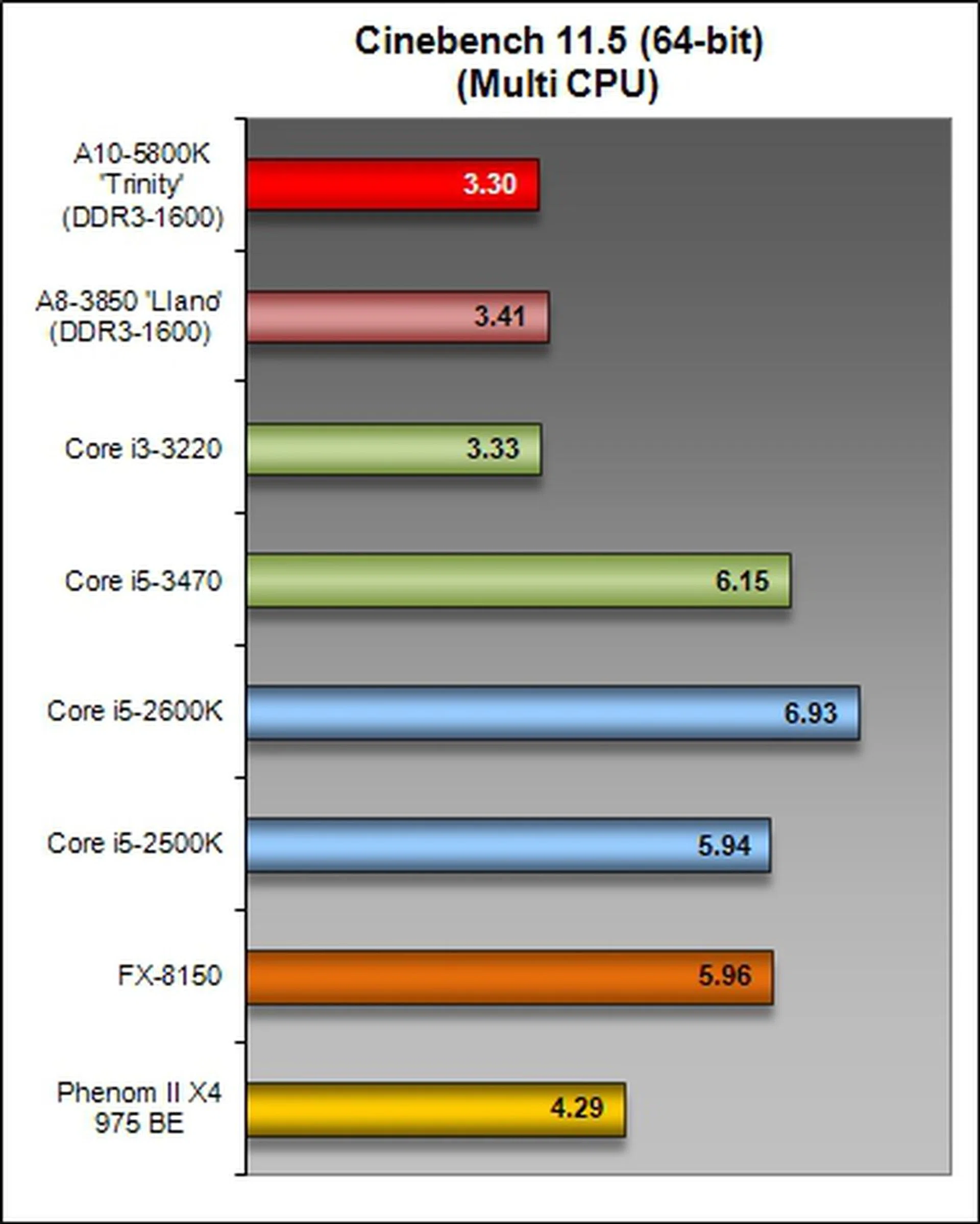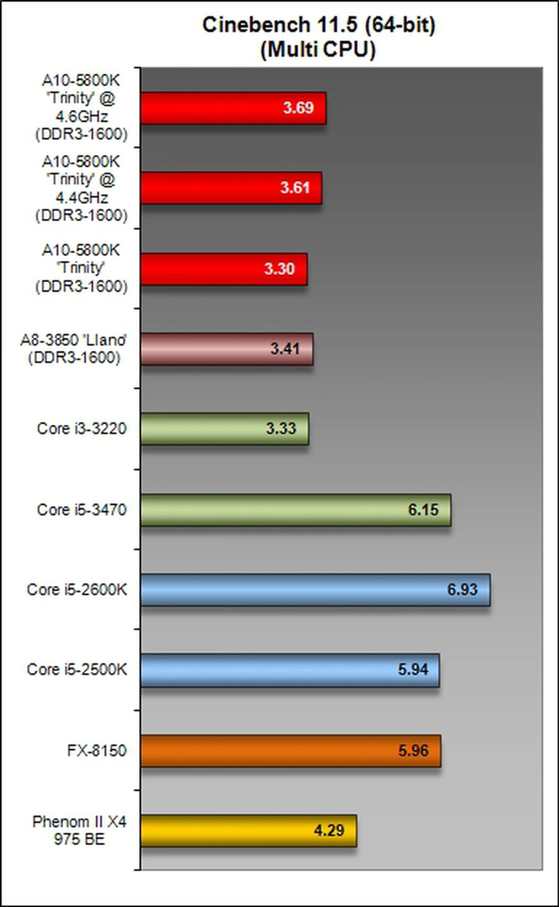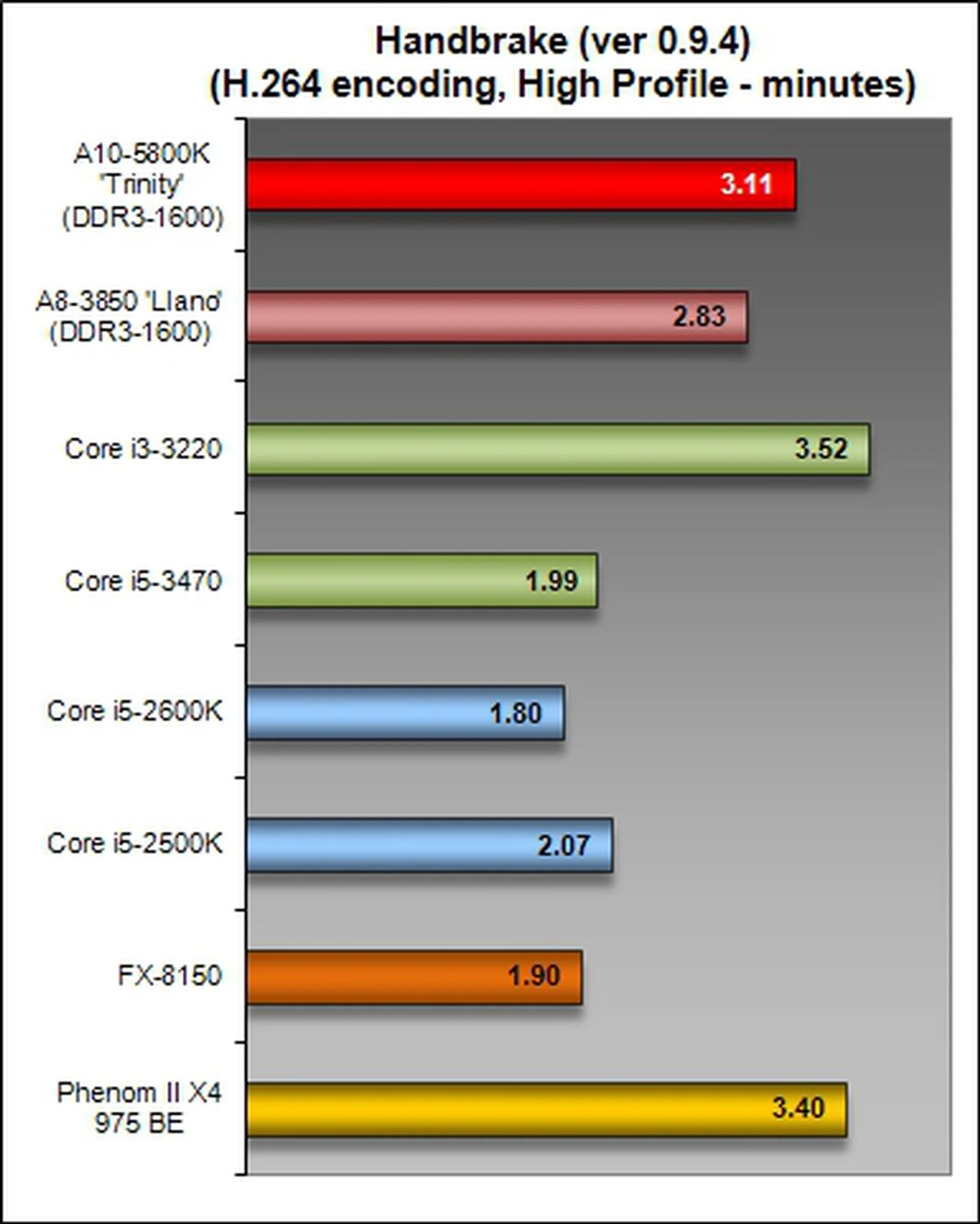 This rendering test again underscores the anemic CPU compute prowess of the flagship Trinity desktop APU. It was just simply outclassed by all its competitors and even by its own older A8-3850 Llano counterpart.