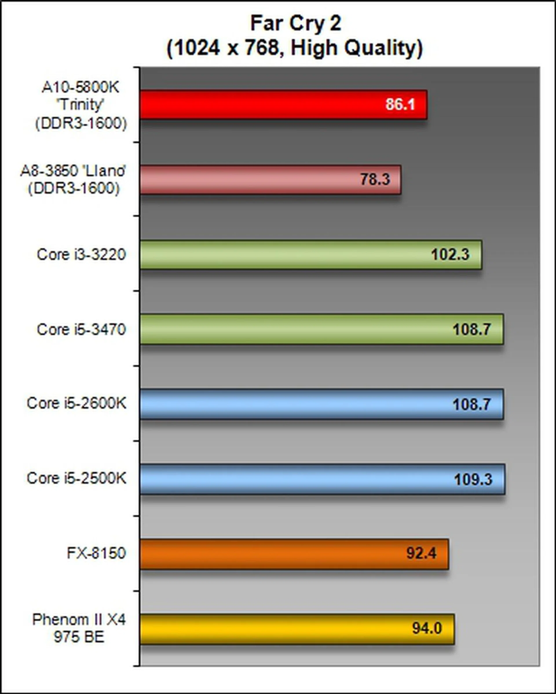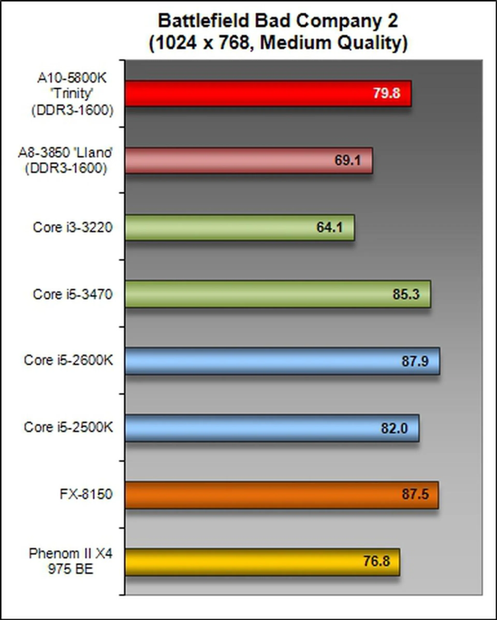 On the more taxing Battlefield Company 2, the A10-5800K turned in much better performance, almost breaking over the 80 FPS mark, while the Llano and Intel Core i3-3220 processors turned in the two lowest results on these tests.