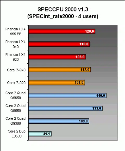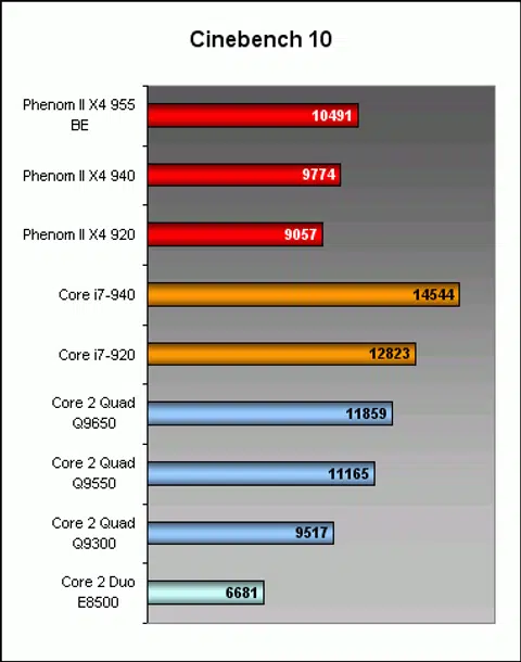 Cinebench 10 being a highly-threaded synthetic rendering benchmark, naturally lapped up the extra logical processing cores of the Core i7 processors with HyperThreading enabled and thus obtained much higher results in this benchmark. Comparing against the Core 2 Quad 9550, it's evident that the Phenom II is still slower and is mostly in-line with the same discrepancy of it floating-point results from the SPEC CPU tests.